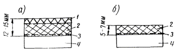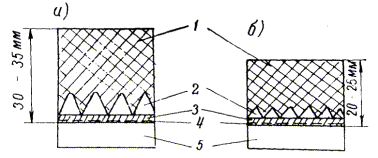 25. Эпослан приготавливают порциями по 5 - 10 л в следующей последовательности: эпоксидная смола марки ЭД-20, эпоксидная смола марки ДЭГ-1 (или жидкий тиокол марки НВБ-2), жидкий сланцевый битум С-1 (С-2 или С-3) и полиэтиленполиамин. 26. Для приготовления эпосланбетонной смеси в эпослан вводят каменный материал. Время перемешивания эпослана с каменным материалом составляет 1 - 1,5 мин, Эпосланбетонную смесь приготовляют порциями по 60 - 100 кг (35 - 55 л). 27. Эпослан и эпосланбетонная смесь должны быть использованы в течение 20 мин после приготовления. 28. Асфальтобетонную смесь приготавливают в соответствии с требованиями ГОСТ 9128-67 и ВСН 93-73. Устройство покрытий из эпосланбетонной смеси 29. Работы на проезжей части моста включают следующие технологические операции: устройство металлических ячеек; подготовку поверхности стального настила; устройство грунтовочного слоя, основного слоя из эпосланбетонной смеси и устройство слоя износа. При производстве работ на тротуарах последняя операция исключается. 30. Металлические ячейки на проезжей части и тротуарах устраивают путем прикрепления стальных полос к настилу точечной приваркой с интервалом через 100 мм (см. рис. 1). 33. Основной слой покрытия укладывают, распределяя эпосланбетонную смесь в ячейках, выравнивая ее и уплотняя. Смесь распределяют и выравнивают заподлицо со стальными полосами ячеек распределителями (типа грабель) с резиновыми пластинами на конце. Уплотняют смесь катком весом 25 - 30 кг за 5 - 6 проходов по одному следу; в случае прилипания смеси к катку подсыпают кварцевый песок. Время твердения эпосланбетонной смеси составляет 1,5 - 2 часа при температуре воздуха около 20 ºС. 34. Для устройства слоя износа на проезжей части наносят вначале эпослан, который распределяют ручными распределителями при норме розлива 1 - 1,5 л/м2, затем дробленый песок по незатвердевшему вяжущему при норме расхода 4 - 5 кг/м2, после чего уплотняют катком весом 25 - 30 кг 2 - 3 проходами по одному следу. 35. Движение автомобилей по проезжей части моста можно начинать через 2 - 3 часа после окончания работ по устройству слоя износа. 36. Производительность бригады рабочих из 5 - 6 человек с комплектом оборудования (разд. 5) при устройстве тонкослойного эпосланбетонного покрытия с грунтовочным слоем износа на проезжей части моста составляет 150 - 200 м2 в смену, а при устройстве эпосланбетонного покрытия с грунтовочным слоем на тротуарах моста - 200 - 300 м2 в смену. 37. Тонкослойное эпосланбетонное покрытие на проезжей части и тротуарах мостов следует устраивать в сухую погоду при температуре воздуха не ниже +15 ºС. Устройство покрытий из асфальтобетонной смеси 38. Работы на проезжей части и тротуарах моста включают следующие технологические операции: подготовку поверхности стального настила; устройство грунтовочного, гидроизоляционного защитного слоев и основного слоя из асфальтобетонной смеси. 39. Поверхность стального настила подготавливают в соответствии с п. 31. 40. Грунтовочный слой устраивают по п. 32. 41. Гидроизоляционный слой укладывают путем равномерного распределения эпослана (2 - 3 л/м2) по грунтовочному слою ручными металлическими распределителями. 42. Для устройства защитного слоя на проезжей части по незатвердевшему гидроизоляционному слою распределяют щебень фракций 10 - 15 мм, на тротуарах дробленый песок фракций 3 - 5 мм при расход