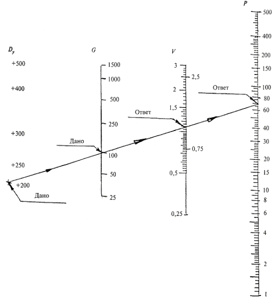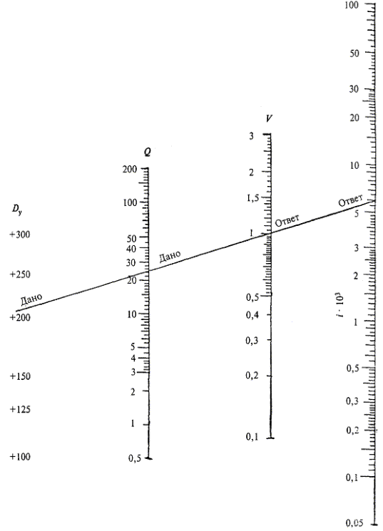 0,000353 где v - коэффициент кинематической вязкости воды, м2/с, зависит от расчетной температуры, с запасом можно принимать для 60 °С v = 0,47 × 10-6 м3/с. 3.3.1.5 Приведенная длина трубопровода, м l′ = l + lэ, (6) где l - длина трубопровода, м; lэ - эквивалентная длина местных сопротивлений, м. 3.3.1.6 Эквивалентная длина, м lэ = Σξ где Σξ - сумма коэффициентов местных сопротивлений отдельных элементов трубопроводов на расчетном участке. 3.3.1.7 Приближенные значения удельных потерь на трение могут быть приняты по номограмме (рисунок 3). При более точном гидравлическом расчете следует пользоваться таблицами по приложению А. 3.3.2 Гидравлический расчет трубопроводов систем горячего снабжения 3.3.2.1 Величина напора Нтр, необходимая для подачи горячей воды потребителю, определяется по формуле Нтр = Σ i l + Σ hм.с, (8) где i - удельные потери напора при температуре воды t, °С (потери напора на единицу длины трубопровода), м/м; hм.с - потери напора в стыковых соединениях и в местных сопротивлениях, м. Примечание - Допускается Σ hм.с принимать равной 10 - 20 % Σ i l. 3.3.2.2 Потери напора на единицу длины трубопровода i без учета гидравлического сопротивления стыковых соединений следует определять по формуле