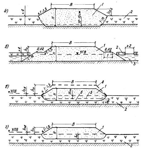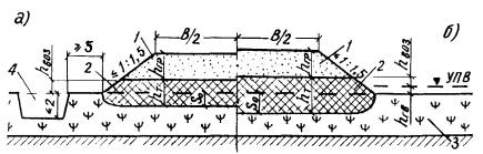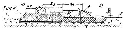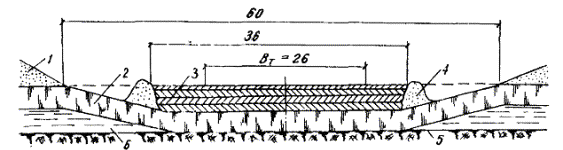 Примечания: 1. Характеристика типов торфяных грунтов приведена в п. 3.2. Толщина выделяемых в слабой толще слоев должна составлять не менее 10 % общей мощности болота. При разработке проекта производства работ следует планировать выполнение основного объема работ на болотах в зимнее время, предусматривая двухстадийное возведение земляного полотна. На первой стадии (зимой) нижнюю часть насыпи из минеральных грунтов отсыпают на высоту не менее 0,6 м; на второй стадии (летом) досыпают земляное полотно до проектных отметок. Такой способ строительства на болотах и озерах позволяет значительно упростить производство работ, повысить качество строительства нижней части насыпи, обеспечить ведение земляных работ высокими темпами с равномерным и максимальным использованием дорожно-строительной техники в течение года. Конструкции земляного полотна8. Выбор конструкции осуществляют на стадии проектирования на основе технико-экономического сравнения с учетом частных факторов (темпа и стадийности строительства, наличия материалов, пересечения коридоров коммуникаций, сопряжения земляного полотна с искусственными сооружениями и др.). Возможные варианты конструкций земляного полотна на болотах приведены на рис. 1-3. 9. Конструкцию земляного полотна с полным выторфовыванием (см. рис. 1, а) применяют на болотах I, II и III-А типов на дорогах с усовершенствованными капитальными покрытиями: при глубине болот менее 2 м и протяженности болот по трассе менее 20 %; при пересечении одиночных болот протяженностью менее 400 м; при пересечении дорогой коридоров коммуникаций, когда строительство дороги опережает строительство коридора коммуникаций; при сопряжении земляного полотна с искусственными сооружениями. Рис. 1. Поперечные профили насыпей на болотах: а - I, II, III-A типа с полным выторфовыванием; б - III-Б типа с посадкой насыпи на минеральное дно; в - I и II типа с частичным выторфовыванием; г - I и II типа без выторфовывания (плавающая насыпь); 1 - насыпь из минерального грунта; 2 - торфяная залежь; 3 - выдавливаемые торфяные отложения или вода; 4 - профиль отсыпаемой насыпи; 5 - линия выторфовывания; 6 - линия посадки насыпи 10. Конструкцию насыпи с посадкой на минеральное дно болота (см. рис. 1, б) предусматривают при проектировании дорог с любыми типами покрытий на болотах III-Б типа и ограниченно на болотах III-А типа. При этом болота не выторфовывают, а посадку осуществляют путем отжатия слабых слоев текучей консистенции массой насыпи. Для ускорения посадки насыпи на минеральное дно необходимо предусматривать соответствующие технологические меры: отсыпку грунта в узкие продольные траншеи, пригрузку или поднасыпные взрывы. 11. Конструкцию земляного полотна с частичным выторфовыванием (см. рис. 1, в) предусматривают на болотах I и II типов при безвыторфовочном методе строительства в случаях: когда упругие деформации превышают допустимую величину, а повышение рабочей отметки не представляется возможным (например, участки сопряжений, примыкания и т.д.); когда необходимо уменьшить величину конечной осадки. Частичное выторфовывание эффективно в тех случаях, когда плотность торфяной залежи увеличивается по глубине. Такое сложение залежей является характерным для болот Западной Сибири. 12. Конструкцию земляного полотна с использованием в качестве несущего основания торфяно