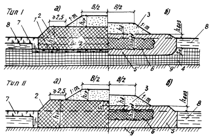 Рис. 3. Поперечные профили насыпей на промороженных основаниях конструкции в период строительства (а) и в процессе эксплуатации на конец теплого периода года (б): 1 - промороженный слой торфяной залежи; 2 - намороженная торфяная плита; 3 - боковые призмы из торфа; 4 - насыпь из минерального грунта; 5 - боковой резерв; 6 - талый слой торфяной залежи; 7 - талые слои торфяной плиты; 8 - граница мерзлого торфяного основания; 9 - минеральное дно болота Если в верхней части торфяной залежи болот I и II типов имеются слои неустойчивой консистенции (мочажины, жидкие образования), насыпи проектируют применительно к поперечному профилю IV, предусматривая удаление слабых слоев зимой и замену их торфом устойчивой консистенции. Нижнюю часть насыпи (намораживаемую плиту) устраивают из торфа боковых резервов (профиль типа I) или из торфа сосредоточенных карьеров (профили типа II-IV), закладываемых на болотах I типа. Торфяную часть насыпи устраивают в серповидном профиле, предусматривая толщину намораживаемой плиты по оси насыпи на 0,2-0,3 м больше, чем по бровкам. Крутизну откосов торфяной насыпи принимают 1:2. 16. Конструкцию земляного полотна при прохождении мелководных озер глубиной до 1,5-2 м (типа оз. Самотлор) назначают в зависимости от несущей способности донных отложений, применительно к поперечным профилям типа I и II (рис. 4), предусматривая устройство торфяной части насыпи в сухом котловане в зимнее время. Крутизну откосов торфяной насыпи принимают не более 1:3. Нижнюю часть насыпи на озерах устраивают из торфа сосредоточенных карьеров, закладываемых на болотах I типа, с соблюдением рекомендаций п. 15. Для обеспечения устойчивости откосов торфяной части насыпи необходимо предусматривать их укрепление (например, фашинами) и присыпку грунтом. В качестве временной защиты для снятия ударного воздействия волны земляное полотно применяют деревянные боны. Рис. 4. Поперечные профили насыпей на озерах: конструкции в период строительства (а) и в процессе эксплуатации на конец теплого периода года (б): 1 - промороженный слой донных отложений; 2 - намороженная торфяная плита; 3 - насыпь из минерального грунта; 4 - талые слои донных отложений; 5 - талые слои торфяной плиты; 6 - граница мерзлого торфяного основания; 7 - лед; 8 - вода; 9 - минеральное дно озера. 17. Методы полного выторфовывания и посадка насыпи на дно болота (или озера) позволяют получить устойчивое земляное полотно с момента его возведения, но требуют больших объемов земляных работ (до 80-100 тыс. м3 минерального грунта на 1 км). Использование торфа в основании и в нижней части насыпей позволяет значительно снизить стоимость и повысить темпы дорожного строительства. Однако необходимое качество и устойчивость земляного полотна будут обеспечены при условии, что оно запроектировано и сооружено с учетом прочностных и деформативных свойств торфяного основания. С учетом высокой эффективности безвыторфовочных методов сооружения земляного полотна в сильно заболоченных районах, отказ от использования торфа при строительстве дорог на Севере должен в каждом конкретном случае быть обоснован технико-экономическим расчетом. 18. Для отсыпки верхней части насыпей на болотах (см. рис. 1-4) можно использовать все виды минеральных грунтов, отвечающих общим нормативным требованиям. Для отсыпки нижней части насыпей (см. рис. 1) предпочтени