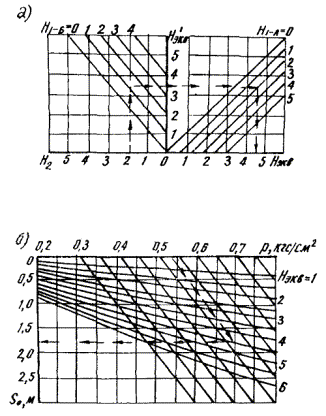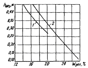 где hвоз - возвышение верха торфяного слоя насыпи над расчетным уровнем воды на болоте, м; определяется по графику (рис. 6) из условия непревышения допустимой влажности Wдоп минерального грунта на границе с торфом; hгв - расчетный уровень воды на болоте, м; при отсутствии длительно стоящих (более 20 суток), поверхностных вод за расчетный уровень принимают поверхность болота hгв=0; So и ST - осадка соответственно торфяного основания и торфяного слоя насыпи, м. 24. Величину осадки основания So определяют согласно п. 22 при расчетной нагрузке, устанавливаемой по формуле