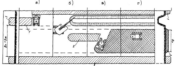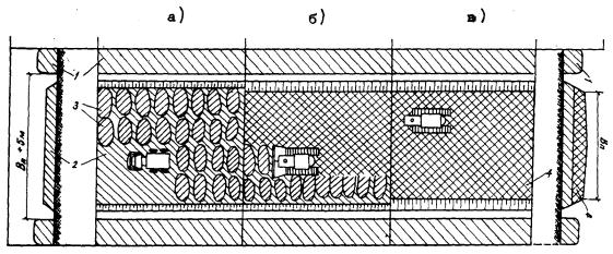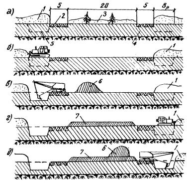 29. При выборе типов и марок машин для выполнения земляных работ необходимо предусматривать: а) техническую возможность и экономическую целесообразность применения тех или иных средств механизации для выполнения конкретных объемов и видов работ; б) степень надежности машин, простоту их устройства и возможность обеспечения их работы при низких отрицательных температурах воздуха, а также необходимые условия для нормальной работы обслуживающего персонала; в) возможность нормальной загрузки выбранных средств механизации в течение всего срока производства работ. 30. При комплектовании механизированных отрядов следует: а) подобрать основные (ведущие) машины для выполнения основных объемов работ, а затем вспомогательные машины и приспособления, с помощью которых можно рационально выполнить все прочие работы; входящие в технологический процесс; б) увязать по производительности выработку основных и вспомогательных машин в расчете на комплексную механизацию всех процессов по сооружению земляного полотна. 31. При сооружении земляного полотна на болотах в зимнее время предусматриваются технологические перерывы между отдельными видами работ. Поэтому целесообразно механизированному отряду планировать выполнение работ по сооружению земляного полотна различных конструкций (с полным выторфовыванием, на промороженных основаниях, плавающую насыпь) последовательно на ряде болот. Участки работ, обслуживаемые механизированным отрядом, должны быть расположены так, чтобы свести до минимума потери времени на переброску строительной техники в периоды технологических перерывов. Выторфовывание болот I типа целесообразно вести не в отвал, а с погрузкой торфа в самосвалы, чтобы использовать его для устройства нижней части насыпи на болотах III типа или на озерах, с технико-экономическим обоснованием дальности возки торфа. При составлении проекта производства работ для механизированных отрядов необходимо учитывать объемы и виды работ по ряду участков, чтобы обеспечить высокие темпы работ с равномерным и максимальным использованием дорожно-строительной техники. Особое внимание следует уделять подготовительным мероприятиям до наступления зимнего периода: изысканию грунтовых и торфяных карьеров и подготовке их для работы зимой; подготовке парка автомобилей и дорожных машин для работы зимой. 32. Личный состав механизированных отрядов должен быть обеспечен передвижными помещениями для отдыха, приготовления и приема пищи, средствами связи (рация) и передвижения. Механизированные отряды наряду с необходимым оборудованием должны быть обеспечены средствами освещения. 33. Технологические приемы и схемы организации работ по отсыпке верхней части земляного полотна из минеральных грунтов на болотах, не отличаются от применяемых при возведении насыпей в обычных условиях из грунтов сосредоточенных резервов. Поэтому ниже рассмотрены в основном особенности организации и производства работ первого этапа строительства (зимой) по подготовке полосы отвода и основания насыпей, а также отсыпки и уплотнения нижней части насыпей на болотах. Технология сооружения земляного полотна методом выторфовывания34. При разработке проекта производства работ по возведению земляного полотна с полным или частичным выторфовыванием (см. рис. 1, а, в) устр