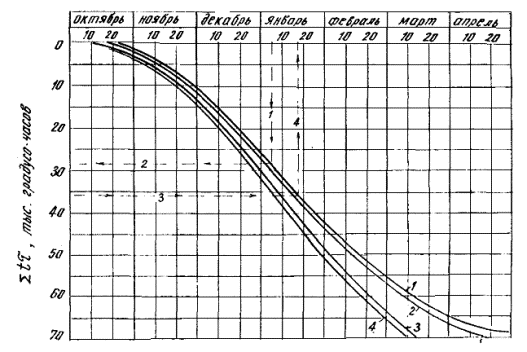 Рис. 9. Технологическая схема устройства торфяной насыпи (второго слоя) на болотах II и III типов: 1 - валы снега и валежника; 2 - первый слой торфяной насыпи; 3 - вывезенный на дорогу торф; 4 - второй слой торфяной насыпи; а - вывозка торфа на дорогу для отсыпки слоя торфяной насыпи автомобилями-самосвалами; б - разравнивание торфа по всей ширине насыпи бульдозером; в - уплотнение слоя торфа в насыпи проходами трактора. Технология сооружения земляного полотна на промороженных основаниях59. Технология сооружения земляного полотна дорог на промороженных основаниях (см. рис. 3) предусматривает: а) подготовительные работы; б) намораживание торфяной плиты и устройство боковых теплоизолирующих призм из торфа; в) отсыпку земляного полотна из минеральных грунтов. 60. Весь технологический процесс можно разделить на три этапа. На первом этапе (осенне-зимний период) выполняют подготовительные работы и намораживают торфяную плиту; на втором (зимне-весенний период) - отсыпают земляное полотно из минеральных грунтов на часть высоты и устраивают теплоизолирующие призмы из торфа. На третьем этапе (летний период) досыпают земляное полотно из минеральных грунтов до проектной высоты. 61. Успешное строительство дорог на промороженных основаниях и эффективность дальнейшей их эксплуатации зависят от полноты использования естественного холода при выполнении работ первого этапа строительства и своевременной отсыпки земляного полотна, чтобы не допустить протаивания торфяной плиты сверху более величины hg= 0,3¸0,4 м. В связи с этим необходимо составлять проект производства работ, в котором указывают сроки начала и окончания того или иного технологического процесса, рассчитывают потребность в машинах и механизмах. Сроки начала и окончания работ устанавливают ориентировочно согласно п. 64, используя средние метеорологические за многолетний период данные. В процессе строительства сроки корректируют с учетом климатических особенностей конкретного зимнего периода. 62. Подготовительные работы, осуществляемые в плановом порядке для быстрейшего промораживания болот по трассе дорог, выполняют согласно пп. 43-47. Дорожную полосу расчищают на ширину промораживаемой полосы плюс 5 м. 63. После расчистки полосы дороги оконтуривают мочажины и озерки-блюдца на промораживаемой полосе, расклинивают их, удаляют торф неустойчивой консистенции и заменяют торфом устойчивой консистенции. Клиновку и разработку мочажин производят экскаваторами-драглайнами; вынутый торф перемещают бульдозерами за пределы промораживаемой полосы. Торф для заполнения мочажин доставляют к месту укладки самосвалами, а перемещают его в мочажины и уплотняют бульдозерами. После заполнения мочажин и озерков торфом устойчивой консистенции его промораживают. Рис. 10. Определение сроков устройства промороженного основания при начале производства работ по проминке и расчистке болота с наступлением зимнего периода: 1 - толщина намораживаемых слоев торфа 0,3 м; 2 - то же, 0,4 м; 3 - то же, 0,6 м. 64. Сроки окончания работ по промораживанию торфяной залежи на требуемую глубину (0,35 - 0,40 м) и намораживанию торфяной плиты слоями сверху ориентировочно устанавливают по графикам рис. 10 и 11, составленным для условий Нижневартовска. По графикам (см. рис. 10 и 11) определяют продолжительность промораживания торфяной залежи на т