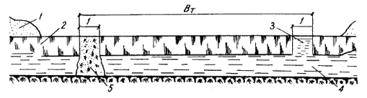 Разрыхленный лед удаляют бульдозерами-болотоходами за пределы траншеи поперечными проходами, затем зачищают дно траншеи. Потребность в машинах для осуществления способа подготовки сухого котлована шириной 25 м и длиной 1 км приведена в табл. 11. 78. При глубине озера более 0,8 м, в целях сокращения сроков устройства сухой траншеи, по бокам будущей траншеи устраивают дамбочки обваловывания. При этом на очищенной от снега полосе шириной 60 м роторным экскаватором делают прорези во льду шириной 1 м по краям траншеи, через каждые 200 м по длине траншеи устраивают поперечные перемычки-дамбочки (рис. 15). Прорези заполняют глинистым грунтом, доставляемым автомобилями-самосвалами, сразу на всю глубину озера. Для безопасной работы роторного экскаватора и самосвалов толщина льда на озере должна быть не менее 0,6 м. 79. После заполнения прорезей минеральным грунтом и полного промерзания его устраивают сухой котлован: а) откачивают воду из котлована (оконтуренных карт размером Вт×200 м) мотопомпами, в результате чего ледяной покров опускается на дно; б) рыхлят лед и удаляют его за пределы траншеи, зачищают дно (п. 77). Недостатком рассмотренного способа является относительно большой расход минерального грунта, например, при глубине озера 1,6 м необходимо завезти и уложить в прорези около 3,6 тыс. м3/км. 80. Способ пригрузки ледяного покрова целесообразно применять на озерах глубиной более 0,6 м. Сущность способа заключается в максимальном использовании естественного холода для послойного намораживания льда сверху и последующей его посадки на дно под действием собственного веса. Работы выполняют в такой последовательности (рис. 16). Будущий котлован по длине разбивают на ряд карт (каждая длиной по 200-250 м), которые обваловывают по периметру снегом. Поверх льда в каждую карту закачивают мотопомпами слой воды толщиной до 10 см. Благодаря нагрузке ледяной покров опускается, а слой воды на льду быстро замерзает. После чего повторно закачивают воду. Операции повторяют до тех пор, пока лед не опустится на дно озера. Рис. 15. Схема устройства дамбочек обваловывания: 1 - валы снега после расчистки дорожной полосы на ширину 60 м; 2 - ледяной покров; 3 - прорези во льду; 4 - вода; 5 - дамбочка из минерального грунта; Вт - ширина подготавливаемой сухой траншеи, равная ширине насыпи понизу Затем лед рыхлят и удаляют его за пределы траншеи, зачищают и планируют дно озера (п. 77). 81. Данный способ позволяет в короткий срок (15 - 20 дней) проморозить озеро глубиной 1,2 м и дно его в пределах дорожной полосы, позволяет вести работы по удалению льда широким фронтом. Наблюдениями установлено, что в зимний период при температуре воздуха -25°С и ниже можно за сутки проморозить слой воды, налитой на ледяной покров, толщиной 7 - 10 см. Потребность в машинах для подготовки сухого котлована шириной 25 м и длиной 1 км приведена в табл. 12. 82. После зачистки дна траншеи устраивают технологический перерыв на промораживание, длительность которого зависит от несущей способности грунтов, слагающих дно озера. Если дно озера сложено минеральными грунтами, глубина промерзания их должна быть не менее 0,1 - 0,15 м (тип II, рис. 4). При наличии слабых донных отложений их необходимо проморозить на глубину Нпр (см. табл. 3). Время промерзания донных отложений на глубину Нпр ориентировочно устанавливают согласно п. 70. Рис. 16. Устройст
