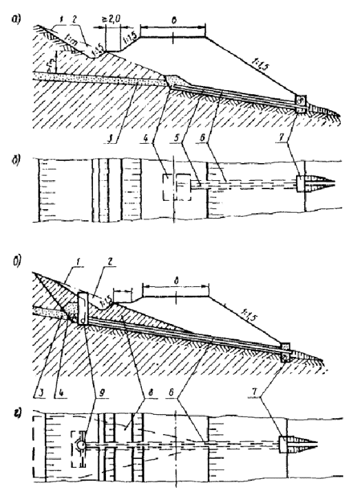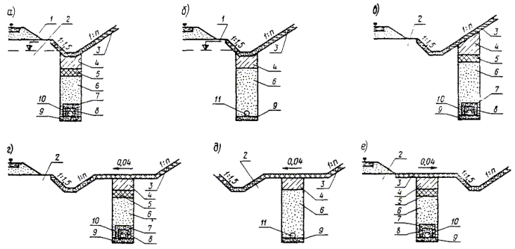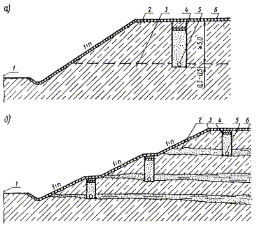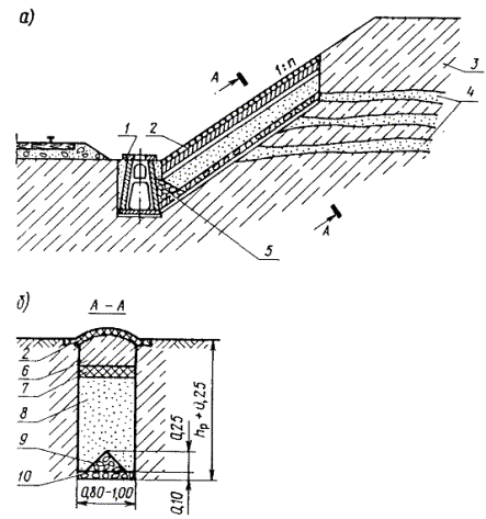 5.4. В случае сосредоточенных выходов воды на откосы скальной выемки целесообразно применять каптажи-водоприемники и, при необходимости, предусматривать мероприятия по предохранению породы от выщелачивания. 5.5. В пределах откосов, имеющих выход воды из отдельных водоносных слоев, следует применять откосные дренажи применительно к рис. 2. Рис. 2. Схема устройства откосного дренажа: а - продольный разрез дренажа; б - поперечный разрез дренажа; 1 - лоток; 2 - укрепление поверхности откоса; 3 - глинистый грунт; 4 - слои водоносного грунта; 5 - фильтр из крупнообломочного материала; 6 - засыпка глинистым грунтом; 7 - водонепроницаемая прослойка; 8 - дренирующий грунт (средний или крупный песок); 9 - глухая дрена из щебня; 10 - слой щебня, втрамбованного в дно траншеи; hр - расчетная глубина промерзания грунта Траншеи дренажа необходимо располагать в местах наибольшего увлажнения грунта на откосе, перпендикулярно к оси полотна, на расстоянии 15 - 20 м между траншеями. Глубину траншей, измеряемую нормально к поверхности откоса, необходимо назначать на 0,25 м ниже расчетной глубины промерзания определяемой согласно [2]. В качестве фильтрующего заполнителя следует принимать крупный и средний песок, а при необходимости предусматривать устройство глухой дрены из щебня или камня (см. рис. 2). 5.6. В местах выхода на откос выемки рассредоточенных источников грунтовых вод, имеющих дебит менее 0,5 м3 с 1 пог. м откоса в сутки, рекомендуется: покрывать откос дренирующим грунтом толщиной слоя не менее 0,5 м (рис. 3, а); укреплять откос решетчатыми конструкциями с заполнением их ячеек дренирующим материалом. Рис. 3. Способы осушения грунта в откосах: а - покрытием дренирующим грунтом; б - накладным дренажом; 1 - расчетная кривая депрессии уровня грунтовых вод; 2 - дренирующий грунт; 3 - укрепление откосов и дна кюветов; 4 - водоносный слой; 5 - обсыпка из щебня; 6 - дренажная труба Для каптажа и отвода выходов грунтовых вод с дебитом более 0,5 м3 с 1 пог. м откоса в сутки целесообразно применять: врезные дренажи контрфорсного типа (см. рис. 3, б), если водоносные слои имеют выход в нижней части откоса; присыпные (прислоненные) откосные дренажи, размещаемые на откосной полке, если водоносные слои имеют выход в средней части высоких откосов. В случаях использования трубофильтров, обратный фильтр из щебня устраивать не требуется, а дренирующий материал в присыпном дренаже можно принимать однородным. 5.7. Для отвода воды, имеющей сосредоточенный выход на откосы выемок из глинистых грунтов, в случаях, когда исключено образование наледей, можно применять открытые водоспуски применительно к рис. 4. Укрепление водоспусков следует назначать в зависимости от предполагаемого расхода воды и скорости ее течения. 5.8. На участках со значительным дебитом грунтовой воды необходимо проектировать ограждающие дренажи, размещаемые с нагорной стороны (рис. 5, а). При этом, расстояние от земляного полотна до дренажа устанавливается из условий получения наименьшей глубины дренажа, размещения его в пределах устойчивости толщи и сохранения устойчивости земляного массива после устройства дренажа. При устойчивом земляном массиве в целях сокращения глубины траншей ограждающий дренаж можно располагать в пределах откоса (см. рис. 5, б). При этом необходимо предусматривать устройство полок, ширина которых назначается с