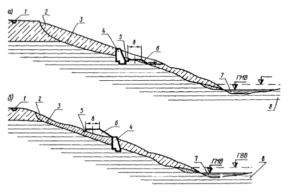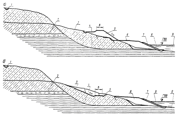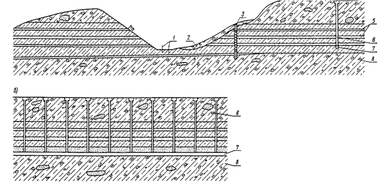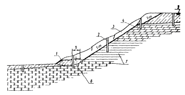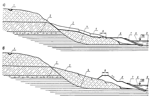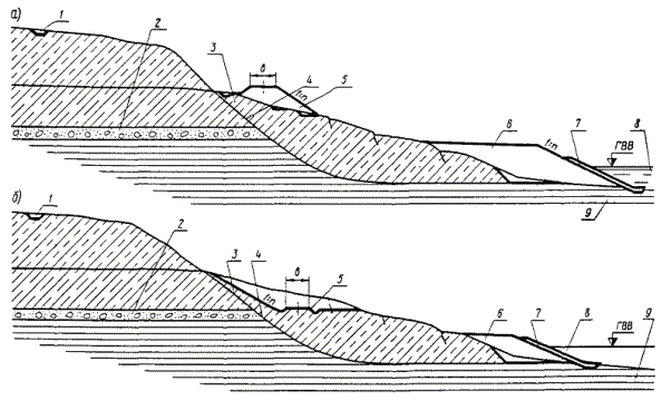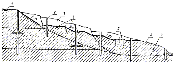 значение коэффициента устойчивости противооползневых подпорных стен В проектах организации работ необходимо предусматривать, чтобы разработка котлованов под фундаменты подпорных стен с подрезкой оползневого склона выполнялась посекционно, при длине секций не более 5 м, и не допускалось производство земляных работ одновременно на соседних секциях. 7.16. Контрфорсы, в виде отдельных столбов или лент вдоль оползневого склона, размещаемых главным образом в нижней части последнего, рекомендуется применять в случаях, когда оползневой массив имеет сравнительно небольшую мощность, и нарушение естественных условий в пределах косогора должно быть минимальным. Контрфорсы следует проектировать в зависимости от наличия местных материалов каменными, из бутовой или сухой кладки, бетонными, бутобетонными или железобетонными. В водонасыщенных грунтах, обладающих достаточной водоотдачей, следует предусматривать дренажные контрфорсы из сухой каменной кладки и, при необходимости, в их основании размещать дренажные трубы и обратный фильтр. Применение контрфорсов в пределах оползневых массивов, сложенных глинистыми грунтами мягкопластичной консистенции не допускается. Подошва контрфорса должна быть заглублена в устойчивые породы, ниже поверхности скольжения. Размеры контрфорсов и их размещение на оползневом массиве в плане устанавливаются расчетом устойчивости их, при условии недопущения выпирания грунта между контрфорсами и смещения оползневого грунта по плоскостям, проходящим выше и ниже верха и подошвы контрфорсов в соответствии со специальными пособиями. 7.17. Шпоны рекомендуется применять, как правило, для предотвращения возникновения структурных оползней 1 типа при сравнительно небольшой мощности зоны возможного сдвига. Они представляют собой железобетонные столбы или призмы, устанавливаемые через шурфы или скважины, с размещением их верхней части в оползневом массиве, а нижней части - в устойчивой, прочной породе ниже поверхности скольжения. В плане шпоны рекомендуется располагать в шахматном порядке. Расстояние между шпонами, глубина заделки их в прочные, подстилающие породы устанавливаются расчетами из условия недопущения перемещения грунта между шпонами, их среза, а также образования поверхностей смещения ниже их концов. Положение верха шпон устанавливается из условия обеспечения устойчивости массива выше их голов. В проектах необходимо предусматривать заделку выработок над шпонами местным глинистым грунтом с хорошим уплотнением последнего. Разгрузка оползневых склонов7.18. Разгрузка оползневых склонов является одним из наиболее эффективных мероприятий по ликвидации существующих оползней и по предотвращению их возникновения. Она предусматривается в большинстве случаев в комплексе с другими противооползневыми мероприятиями. Разгрузка оползневого косогора обеспечивается частичной или полной срезкой грунта в активной части оползня с перемещением его в пассивную зону (рис. 18), а также террасированием склона. Удаление грунта из пассивной части склона следует запрещать. Профиль проектируемого откоса должен быть обоснован расчетами на устойчивость. Рис. 18. Схема проектного решения по обеспечению устойчивости земляного полотна на оползневом косогоре: а - с частичным удалением оползневого массива и