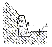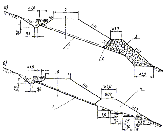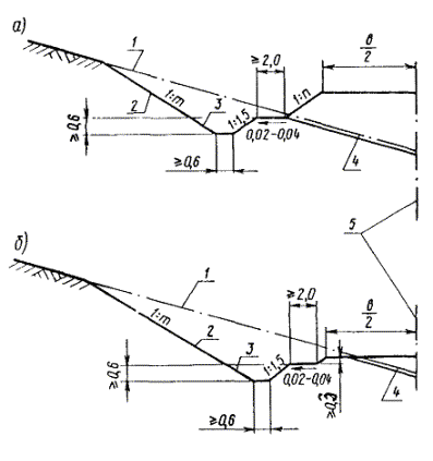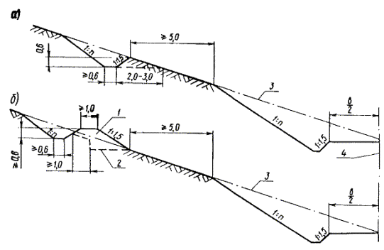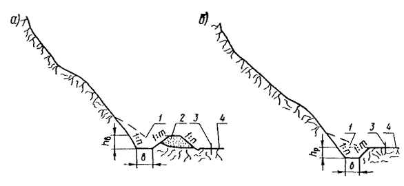 6.10. Расчеты прочности подпорных стен следует выполнять в зависимости от материала, используемого для стен [1, 16]. 6.11. Упорные призмы (рис. 8, а) в зависимости от местных условий можно проектировать из каменной наброски, с крутизной наружного откоса 1:1,3; или, при необходимости, из каменной наброски, с выкладкой камня по наружной поверхности откоса крутизной 1:1. По плоскости внутреннего откоса упорной призмы следует предусматривать отсыпку промежуточного слоя из камня мелких размеров, щебня и других хорошо дренирующих материалов. Для контрбанкетов (см. рис. 8, б) может быть применен песок, гравий и другие дренирующие материалы. Размеры призм и контрбанкетов предварительно назначаются равными: высота - 1/3 высоты откоса поддерживаемой насыпи, ширина бермы - не менее 3 м, и уточняются после проверки расчетом общей устойчивости всего сооружения. При мощности рыхлых отложений до 3 м нижнюю часть контрбанкета следует заглублять в коренные породы в виде зуба. 6.12. Кавальеры на косогорных участках разрешается размещать только с низовой стороны, по возможности, у подошвы склона. При расположении кавальера в пределах косогора необходимо проверять общую устойчивость склона. 6.13. В пределах косогоров, где возможны инфильтрация атмосферных вод и нарушение устойчивости склона, необходимо предусматривать в нагорной его части: общую планировку поверхности с ликвидацией бессточных западин; укрепление поверхности растительными или искусственными водонепроницаемыми покрытиями; устройство системы осушительных водоотводов и др. 6.14. Размеры поперечного сечения нагорных, водоотводных канав и кюветов (рис. 9, а) следует определять по расчетному расходу воды с установленной вероятностью превышения [11]. 6.15. В пределах местных понижений рельефа для сохранения соответствующей глубины нагорной канавы допускается устройство валиков из хорошо уплотненного глинистого грунта применительно к рис. 9, б. При этом глубина канавы в грунте естественного сложения должна быть не менее расчетной глубины воды, а низовой откос канавы и поверхность валика - укреплены. Рис. 8. Поперечные профили насыпей с упорными устройствами на крутых косогорах: а - с упорной призмой; б - с контрбанкетом; 1 - растительный слой, подлежащий удалению; 2 - крупнообломочный материал; 3 - упорная призма (наброска из камня); 4 - контрбанкет, возводимый из дренирующего материала Рис. 9. Поперечные профили нагорных канав: а - заглубленных в грунт естественного сложения; б - частично заглубленных; 1 - валик из местного грунта; 2 - уступы в основании валика; 3 - поверхность косогора до устройства выемки; 4 - ось проектируемого полотна 6.16. В случаях, когда продольный уклон косогора окажется более уклона канавы, соответствующего допустимой скорости течения воды при принятом типе ее укрепления, необходимо предусматривать устройство перепадов, быстротоков и водобойных колодцев или ярусное размещение канав [11]. 6.17. В пределах косогоров круче 1:2, а также в других случаях, когда устройство нагорной канавы окажется нецелесообразным, разрешается перехват воды, поступающей с косогора, осуществлять посредством углубленных кюветов (рис. 10, а, б). При этом размеры кюветов необходимо назначать по расчетному расходу с установленной вероятностью превышения [11]; бровку кювета со стороны полотна размещать выше расчетного ур