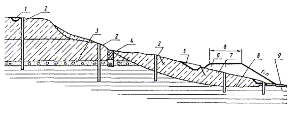 где К - параметр, принимаемый равным 6·10-3; υ10 - расчетная максимальная скорость ветра, измеренная на высоте 10 м над статическим уровнем, м/сек, определяемая по [22]; L - длина разгона ветровой волны, км, определяемая по [22]; a - угол между продольной осью насыпи и направлением ветра; g - ускорение свободного падения, м/с2; Н - глубина, м. 13.12. Величина повышения расчетного статического уровня воды за счет стеснения русла насыпью hподп устанавливается с учетом величины подпора перед мостом, определяемого при возможном размыве русла под мостом, но не более 50 % площади наибольшего расчетного размыва; уклона потока вдоль земляного полотна с верховой стороны подходов к мосту, а также наличия и размещения мостовых струенаправляющих дамб. При пересечении трассой водохранилищ учитывается только величина подпора перед мостом. 13.13. Бровка земляного полотна на подходах к мостам на малых водотоках и у труб должна быть выше отметки подпорного уровня, определяемого по расходам согласно п. 13.7, не менее чем на 0,50 м для мостов и труб при безнапорном режиме и не менее чем на 1,0 м для труб отверстием 2,0 м и более при напорном и полунапорном режимах. 13.14. Конструкцию насыпи, в том числе крутизну откосов и размеры берм, следует назначать по условиям устойчивости земляного полотна, способов производства работ и типа укрепления откосов. В отдельных случаях, при соответствующем обосновании, вместо укрепления откосов допускается их уположение. При проектировании насыпей на слабых основаниях необходимо учитывать их осадку в соответствии с [10, 11]. 13.15. При косом пересечении поймы трассой или при прямом пересечении реки с широкими поймами, а также в случаях долинных ходов по пойме, при разности уровней воды с верховой и низовой сторон более 1,0 м, необходимо проверять расчетами работу насыпей, как плотин. 13.16. В основании насыпей при поперечном уклоне круче 1:10 на участках со стоячей водой и круче 1:20 в пределах водотоков необходимо предусматривать устройство уступов. Если в основании насыпи залегает слой ила, следует предусмотреть его удаление или отжатие весом насыпи. В случаях, когда удаление ила и нарезка уступов в основании насыпи невозможны или нецелесообразны по технико-экономическим соображениям, нижнюю часть насыпи следует проектировать из камня с устройством контрбанкеты, а в проекте производства работ необходимо предусматривать поперечную отсыпку нижней части насыпи, начиная с верховой стороны полотна. При возведении насыпи на участках с проточной водой можно проектировать предварительную отсыпку призм из камня, с обязательной отсыпкой промежуточного слоя из камня мелкого размера. Участки насыпи между призмами допускается возводить при помощи регулирования. Гидравлический расчет фильтрующих насыпей рекомендуется выполнять в соответствии с приложением 13. 13.17. Нижнюю подтопляемую часть насыпей следует проектировать в соответствии с [11] из дренирующих грунтов или легких супесей; не разрешается использовать для этой цели грунты меловые, тальковые и трепельные; жирные, мергелистые и сланцевые глины, котельные шлаки, а также засоленные грунты, в том числе с содержанием гипса более 5 %. Верхнюю надводную часть насыпи разрешается проектировать из не дренирующих грунтов. 13.18. Расчет устойчивости откосов подтопляемых насыпей следует выполнять согласно по