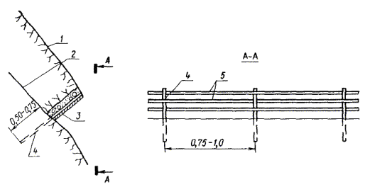 По назначению и характеру работы следует различать: дренажи, ограждающие оползневые массивы от попадания в них грунтовых вод из внешних подземных бассейнов; в качестве ограждающих устройств можно применять закрытые, вертикальные и комбинированные дренажи, штольни; дренажи, осушающие рыхлые отложения в пределах оползневого массива; в качестве осушающих устройств можно применять дренажные прорези и откосные дренажи открытого типа, каптажные устройства. Типы, конструкцию и размеры ограждающих и осушающих дренажей следует назначать с использованием [44], альбома водоотводных устройств и специальных пособий. 7.29. При проектировании ограждающего дренажа необходимо: размещать его вне оползневого массива за бровкой оползневого срыва применительно к рис. 22 на расстоянии, предохраняющем дренаж от разрушения в результате возможного возникновения одного или двух оползневых смещений с учетом интенсивности отрыва блоков; заглублять лоток дренажных устройств в водоупорную породу; назначать тип и конструкции дренажа с учетом гидрогеологических, геолого-литологических условий, рельефа склона, характера оползневых смещений и других природных факторов; размещать водосбросные устройства, как правило, на устойчивых участках склона, с укреплением и изоляцией их дна и откосов. 7.30. При проектировании осушающих дренажей следует предусматривать: расположение дренажей в направлении вероятного смещения земляных масс; осушение грунтового массива ниже поверхности скольжения; перехват отдельных источников-родников временными каптажными устройствами с самостоятельными выпусками или с выпусками в сооружения поверхностного водоотвода. 7.31. Для перехвата и отвода грунтовых вод на глубине от 2 до 5 м следует применять закрытые дренажи траншейного типа. Верхнюю часть траншеи необходимо заполнять водонепроницаемым глинистым грунтом толщиной слоя не менее 0,5 м с укладкой между ним и фильтрующим заполнителем изоляции из битума, дерна и других местных материалов. Рис. 22. Схема устройства земляного полотна на укрепляемом оползневом косогоре: 1 - водоотводная канава; 2 - скважины; 3 - водоносный слой с напорной грунтовой водой; 4 - дренаж; 5 - поверхность откоса, укрепляемая от инфильтрации поверхностных вод; 6 - проектируемое земляное полотно; 7 - оползневой массив; 8 - вероятная поверхность скольжения оползневого массива; 9 - скальная порода 7.32. Перехват грунтовых вод, залегающих на глубине более 5 м, целесообразно осуществлять дренажами штольневого типа. Размеры штолен следует назначать с учетом обеспечения нормальных условий эксплуатации сооружений. Дренажные штольни в качестве ограждающих сооружений следует применять в случаях, когда применение дренажей окажется невозможным или нецелесообразным по технико-экономическим соображениям. Применение штолен целесообразно на склонах главным образом с оползневыми массивами 1 типа, (см. приложение 5) при наличии выраженного потока грунтовых вод и водоупора, залегающего на большой глубине. Штольни следует размещать в коренных породах у нижней границы зоны распространения трещин выветривания применительно к рис. 23. Рис. 23. Схема размещения противооползневых устройств: 1 - нагорная канава; 2 - скважины; 3 - напорный уровень подземных вод; 4 - оползневой массив; 5 - поверхности скольжения оползневого массива;