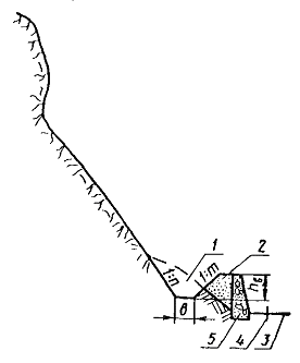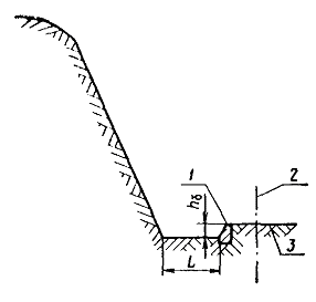 Рис. 32. Схема закрепления неустойчивых пластов породы: 1 - скальная порода; 2 - анкеры; 3 - ось пути; 4 - проектируемое земляное полотно 11.19. Укрепление склонов древесно-кустарниково-травяной растительностью местных пород следует применять при наличии на склоне поверхностного выветрившегося слоя мощностью не менее 0,5 м. 11.20. Противообвальные защитные сооружения следует проектировать для защиты железных и автомобильных дорог от падения одиночных камней, а также от осыпей и небольших скальных обвалов в случаях, когда укрепительные сооружения не обеспечивают необходимую степень безопасности движения транспорта, например, вследствие большой удаленности друг от друга или слабой выраженности неустойчивых участков, большой протяженности или высоты склонов и откосов и т.д. Грунтовые улавливающие сооружения, стены и сети можно располагать непосредственно у подошвы откоса или склона (путевые улавливающие сооружения) и на склоне (склоновые или нагорные улавливающие сооружения). Улавливающие полки и противообвальные галереи целесообразно располагать только у подошвы откосов и склонов, а надолбы - на склонах. 11.21. Путевые улавливающие траншеи (рис. 33), полки с барьером (рис. 34) или бордюром (рис. 35) следует проектировать для защиты дороги от падения камней с откосов высотой до 60 м и крутизной не менее 35°. Их применение целесообразно на участках со склонами, не являющимися в природных условиях опасными в отношении возникновения скально-обвальных явлений вследствие залесенности и других причин. Их можно применять также около скально-обвальных склонов при наличии достаточного расстояния от подошвы склона до земляного полотна. Откосы скальных выемок и полувыемок в устойчивых породах в случаях устройства путевых улавливающих траншей и полок целесообразно проектировать крутизной от 1:0,2 до 1:0,5. Дну улавливающих траншей следует придавать продольный уклон, равный уклону пути, но не менее 2 ‰. В необходимых случаях путевой откос траншеи должен быть укреплен от размыва. Рис. 33. Схема устройства путевой улавливающей траншеи: L - ширина и hт - высота траншеи, назначаемые по расчету; 1 - ось пути; 2 - проектируемое земляное полотно Рис. 34. Схема устройства путевой улавливающей полки с барьерной стенкой: L - ширина полки, назначаемая по расчету; hc - высота барьерной стенки, назначаемая по расчету; 1 - стенка; 2 - лоток; 3 - ось пути; 4 - проектируемое земляное полотно Рис. 35. Схема устройства путевой улавливающей полки с бордюрной стенкой: L - ширина полки, назначаемая по расчету; hб - высота бордюрной стенки, назначаемая по расчету; 1 - стенка; 2 - ось пути; 3 - проектируемое земляное полотно 11.22. Путевые улавливающие валы и рвы (рис. 36) целесообразно применять при размещении полотна у подошвы затяжных оголенных склонов, являющихся самостоятельными источниками скально-обвальной опасности, когда расстояние между подошвой склона и защищаемой дорогой окажется достаточным. Путевые рвы отличаются от путевой траншеи большими размерами. Они предназначаются для задержания скальных обломков, падающих с затяжных склонов с большой скоростью. Рис. 36. Схема защиты полотна, размещенного у подошвы скально-обвального затяжного косогора: а - посредством рва с валом; б - посредством рва без вала; 1 - ров; 2 - вал; 3 - ось пути; 4 - проектируемое земляное полотно; hв - глубина рва с валом и hp - то 
