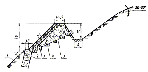 Ширина каменной наброски в верхнем бьефе, где глубина воды равна hв, определяется с учетом формы поперечного сечения и одинаковом заложении откосов по всей длине фильтрующего сооружения. 12. Высота каменной наброски в верхнем бьефе назначается на 0,5