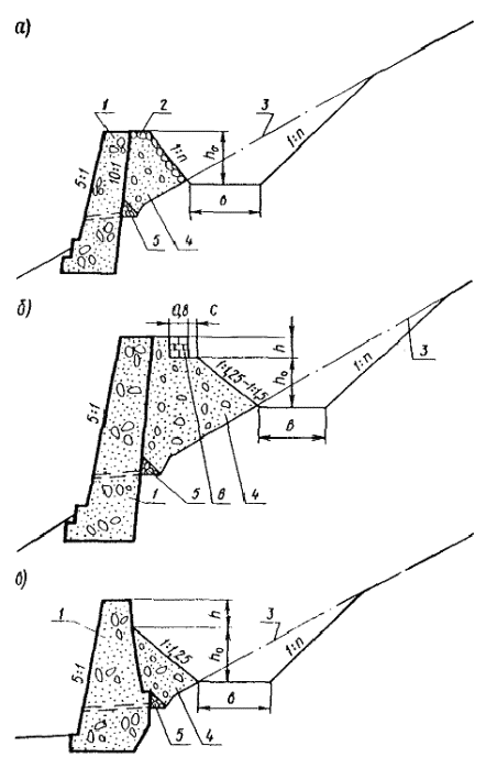 где Во, Но - соответственно ширина и высота наибольшей волны селевого потока на подходном участке, устанавливаемые в период изысканий, м; υср - средняя скорость селевого потока, принимаемая в пределах 4 - 3 м/сек в зависимости от продольного уклона русла и глубины потока. 10.8. Минимальную высоту отверстия селепропускных мостов, м, можно определять по формулам: Н = Hо + n ho + 1,5; (20) Н = μ Но + n ho + 1,5, (21) где В - ширина отверстия моста, м; 1,5 - запас высоты отверстия, м; n - среднее число селей за расчетный период; ho - мощность отложения в русле при проходе одного селя, м. Формулы (18) и (19) следует использовать для расчета отверстия мостов соответственно без стеснения русла отверстием и со стеснением, размещаемых на участках русла, где обеспечивается транзитный пропуск селей. Формулы (20) и (21) следует использовать для расчета отверстия мостов соответственно без стеснения русла отверстием и со стеснением на участках русла, где не полностью обеспечивается транзитный пропуск селей. Стеснение потока по высоте отверстия не допускается. 10.9. Стеснение потока отверстием по ширине допускается в пределах, не превышающих 40 % расчетной ширины потока Во при обязательном условии сопряжения потока с подмостовым отверстием регуляционными направляющими сооружениями. 10.10. Регуляционные сооружения на расстоянии 150 - 200 м с верховой и низовой сторон мостового перехода необходимо проектировать с плавными и небольшими (до 12°) поворотами. Селевые потоки значительной мощности можно пропускать через несколько искусственных сооружений, для чего следует предусматривать деление потока дамбами, размещаемыми у выхода ущелья в долину. 10.11. Селеспуски, размещаемые над земляным полотном в виде лотков - галерей целесообразно применять в случаях размещения оси полотна на расстоянии 20 - 30 м от подножья склона, когда возможно проектирование селеспуска с продольным уклоном не менее 0,15 и плавным вписыванием входных оголовков селеспуска в берега. При этом разность сопрягающихся уклонов русла и лотка селеспуска не должна превышать 0,04 - 0,05. Следует предусматривать также отвод лотка селеспуска с низовой стороны земляного полотна с продольным уклоном не менее 0,20. 10.12. Запруды (барражи) размещаются в селевых логах поперек направления потока в виде стен из каменной наброски, каменной кладки на цементном растворе и других материалов. Учитывая, что одиночные барражи не обеспечивают затухания селевой деятельности, рекомендуется проектировать систему барражных стен с очередностью строительства вверх по течению до селеобразующих очагов в верховьях логов. Стены целесообразно размещать в суженных местах русла и создавать селехранилища возможно большего объема. Сроки строительства барражей следует назначать в зависимости от срока заноса селехранилищ. При статическом расчете стен на скольжение коэффициент трения следует принимать не более 0,4 кг/см2; нормативный коэффициент устойчивости на скольжение и опрокидывание от динамической нагрузки коэффициент следует принимать с учетом положений п. 2.4; при динамическом расчете барражных стен следует учитывать удары камней максимального размера. В целях исключения бокового размыва заграждения необходимо предусматривать заделку барражных стен в береговые склоны. 10.13. Полузапруды в виде траверсов и шпор можно применять при необходимости о