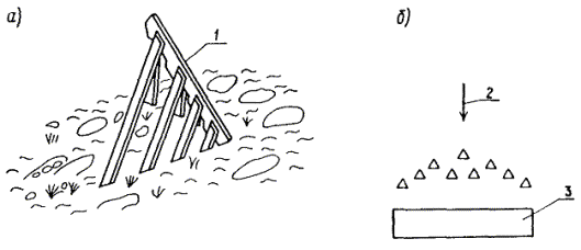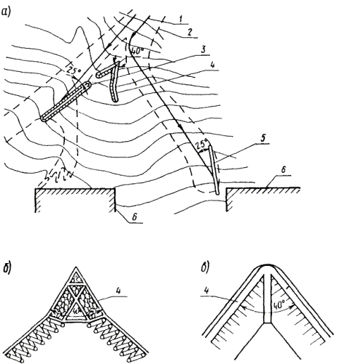 16.5. Мероприятия II группы целесообразно применять при относительно небольших площадях лавиносборов и сравнительно пологих склонах в районах с наличием влажного, плотного снега, отложения которого обладают достаточной прочностью. Наиболее экономичными сооружениями этой группы являются сборные удерживающие щиты, свайные конструкции и террасирование склонов. Расположение сооружений и их конструкция определяются расчетом. Террасы следует применять на устойчивых склонах крутизной до 30°, сложенных малоразмываемыми грунтами. Подпорные стены целесообразно применять при наличии на месте материала для кладки и при незначительной мощности отложений нескальных грунтов. Лесонасаждение может быть применено как самостоятельное мероприятие в местах восстановления уничтоженного леса, а также в комплексе с плетневыми заграждениями или деревянными заборами. 16.6. Мероприятия III группы разделяются на устройства: отводящие, задерживающие и пропускающие лавины над защищаемым объектом. Для отвода лавин в сторону от защищаемого одиночного объекта можно применять лавинорезы, направляющие дамбы или стены (рис. 44). Эти сооружения не защищают объекты от действия воздушной волны. К сооружениям, задерживающим лавину, относятся отбойные стены и дамбы (рис. 45), лавинозащитные заборы, тормозящие клинья (рис. 46). Их следует размещать примерно нормально к направлению движения лавины. Рабочая грань дамб должна быть укреплена бетонными или каменными стенами или железобетонными плитами. Для пропуска лавин над защищаемым объектом можно применять навесы (рис. 47), галереи и тоннели. Эти сооружения являются самым надежным, но дорогим способом защиты. Их целесообразно применять на участках действия узких по фронту, крупных, а также «прыгающих» лавин. Навесы и галереи необходимо проектировать с расчетом на то, чтобы лавина не ударялась, а скользила по кровле. Навесы и галереи следует проектировать согласно [21]. 16.7. В проектах необходимо обуславливать, что строительство противолавинных сооружений II и III групп должно быть полностью закончено до прохода первых осенних лавин. Рис. 44. Схемы устройств для отвода снежных лавин: а - план расположения сооружений; б - план ряжевого лавинореза; в - план лавинореза из камня; 1 - направления движения лавины; 2 - контуры конусов выноса; 3 - направляющая дамба; 4 - лавинорез; 5 - направляющая стена; 6 - защищаемые объекты Рис. 45. Схема сооружений для задержания лавин: а - стена; б - дамба со стеной; в - дамба со рвом; 1 - каменная наброска; 2 - стена; 3 - дамба из местного грунта; 4 - стены из бетонных блоков; 5 - поверхность склона до устройства рва; 6 - ров 16.8. Искусственное обрушение снежного покрова с целью периодической разгрузки склонов, является одним из действенных противолавинных мероприятий. Эти работы следует предусматривать проектами в местах, где экономически нецелесообразно строительство дорогостоящих противолавинных сооружений, и где имеется возможность временных перерывов в эксплуатации защищаемого объекта. Искусственное обрушение не рекомендуется применять в случаях: когда возможно образование больших снежных завалов пути, работы, по расчистке которых будут продолжаться длительное время; один очаг вызывает образование нескольких лавин в течение сезона; в рассматриваемом районе имеется мало лавинных очагов. Для выпо