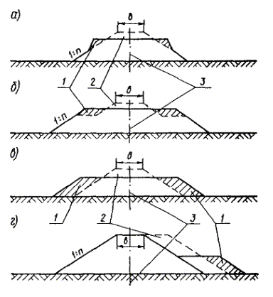Грунты, разрабатываемые в карьере, не должны содержать свыше 1 % крупных включений с размерами более приходного сечения рабочего колеса землесоса и более 5 % валунов - при разработке грунтов гидромониторами. 17.7. Средства гидромеханизации могут быть применены для возведения насыпей под второй путь, запроектированных в виде присыпок к существующему полотну с использованием дренирующих грунтов. 17.8. Земляное полотно, возведенное с применением средств гидромеханизации, должно удовлетворять установленным требованиям [11] в отношении основных конструктивных параметров полотна; при этом плотность грунта в теле насыпей не нормируется, поскольку необходимая плотность грунта достигается в процессе производства работ по намыву земляного полотна. 17.9. Расчет устойчивости насыпей и откосов выемок в случае применения гидромеханизации следует выполнять на основе материалов детального обследования инженерно-геологических условий. Расчетную схему и метод расчета следует принимать с учетом ожидаемого режима работы земляного полотна как в период строительства, так и при эксплуатации согласно разделам 1 и 2. Устойчивость необходимо проверять для поперечных профилей насыпей, отражающих наиболее неблагоприятные сочетания различных факторов, отрицательно влияющих на устойчивость откосов. В частности, необходимо учитывать: геологическое строение основания насыпи (наличие, мощность и характер расположения прослоек грунта со слабой несущей способностью, наличие наклона слоев); наличие грунтовых вод; глубину водоема или водотока в случае подтопления насыпи; конструкцию покрытия откосов насыпи для защиты их от размыва волновыми воздействиями или течением воды и др. Расчетные параметры следует принимать с учетом состояния и свойств используемых грунтов. 17.10. Средства гидромеханизации могут быть использованы для устройства присыпок к существующему земляному полотну при условии, что устойчивость и нормальная работа существующего земляного полотна будут обеспечены при строительстве и в период эксплуатации. Насыпи из мелких и пылеватых песков, а также присыпки из песков крупных и средней крупности к существующему земляному полотну при ширине присыпок менее 6 м возводятся средствами гидромеханизации на неполную высоту. Верхнюю часть таких насыпей и присыпок возводят сухим способом. При этом запас грунта, необходимый для верхней части насыпи и присыпки, может создаваться намывом и размещаться на откосах, бермах или нижней части полотна (рис. 48). Форму и размеры размещения запаса грунта следует принимать по условиям удобства работ по намыву и наименьших затрат при последующем перемещении грунта в тело верхней части насыпи. Рис. 48. Поперечные профили насыпей из дренирующих грунтов с размещением запасов грунта: а - на откосах; б - на берме; в - в нижней части полотна; г - то же в случае присыпки к существующему полотну; 1 - запас грунта; 2 - контуры части насыпи, возводимой механическими средствами из запасов; 3 - ось пути; 4 - ширина земляного полотна 17.11. В нижней части насыпей на болотах 1 типа необходимо предусматривать устройство подушек со свободными откосами (рис. 49, а). Крутизну свободных откосов, формирующихся при намыве наземной части насыпей, следует определять в зависимости от средней крупности частиц грунта и удельных расходов поток