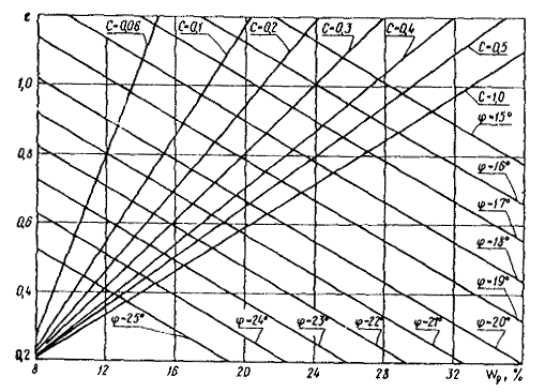Для ориентировочной оценки местной устойчивости откосов выемок, при отсутствии данных лабораторных определений Ср и jр допускается использование нормативных значений Сн и jн, приведенных на рис. 3, согласно [2]. При этом значение коэффициента пористости Ер определяют с учетом набухания и пучения промерзающего грунта по формуле Расчетные значения величины сцепления Ср определяются с учетом снижения прочности грунта после оттаивания по формуле