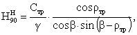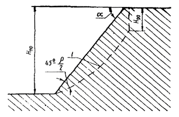 5. При благоприятном расположении поверхностей ослабления, (рис. 4), когда угол между поверхностью откоса и поверхностью ослабления более (90° - ρтр), предельную высоту устойчивого откоса Нпр различной крутизны можно принимать по табл. 4 в зависимости от Н90, определяемой по формуле (1). Рис. 4. Расчетная схема наклонного откоса при благоприятном расположении плоскостей ослабления: 1 - контур вероятной поверхности обрушения 6. При благоприятном расположении поверхностей ослабления (рис. 5), когда угол между поверхностью откоса и поверхностью ослабления менее (90 - ρтр), предельную высоту устойчивого откоса различной крутизны можно принимать по табл. 5, в зависимости от Н90, определяемой по формуле (1). Рис. 5. Расчетная схема наклонного откоса при незначительном наклоне поверхностей ослабления: 1 - контур вероятной поверхности обрушения Примеры определения предельной высоты устойчивых скальных откосов Исходные данные. Массив скальных пород представлен песчаниками, имеющими горизонтальную слоистость и следующие физико-механические характеристики: g = 2,39 т/м3; С = 1010 т/м2; ρ = 34°; ℓср = 0,42 м; Стр = 5 т/м2. Требуется определить, какую максимальную высоту можно придать откосу проектируемой в этом массиве выемки, при условии придания ему вертикального очертания. Решение. Коэффициент запаса принимаем равным 1,3. С учетом этого определяем расчетные значения: