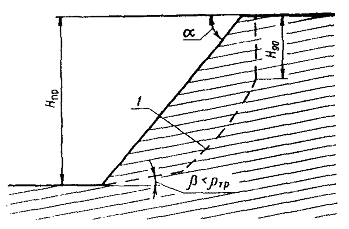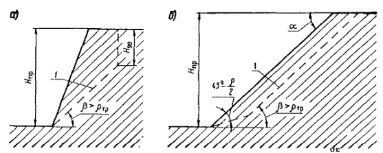 предельную высоту устойчивого вертикального откоса где b - угол наклона поверхностей ослабления к горизонту, град; ρтр - угол внутреннего трения по контактам поверхностей ослабления, град, принимаемый по результатам испытаний или по табл. 3. Рис. 2. График зависимости коэффициента а от сцепления породы в образце 3. При неблагоприятном расположении поверхностей ослабления (рис. 3, а) предельная высота Hпр устойчивого откоса различной крутизны определяется по формуле где a - угол наклона проектируемого откоса, град. 4. При неблагоприятном расположении поверхностей ослабления (b > ρтр) и совпадении угла наклона откоса с углом наклона поверхностей ослабления (a = b, Рис. 3, б) предельная высота устойчивого откоса Hпр определяется по формулам: Рис. 3. Расчетная схема наклонного откоса при неблагоприятном расположении плоскостей ослабления: а - поверхность проектируемого откоса с поверхностями ослабления не совпадает; б - совпадает; 1 - контур вероятной поверхности скольжения Таблица 2