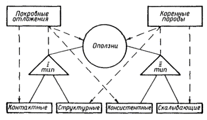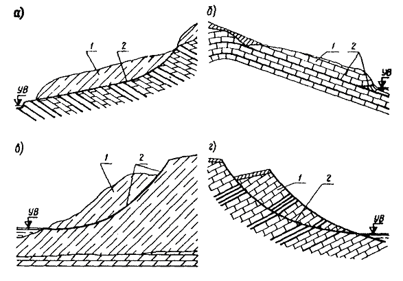 Вывод. В данном массиве откос под углом 60° может быть запроектирован высотой до 61 м. Приложение 5Классификация оползней1. По условиям развития и формам проявления, зависящим от геологической среды и характера ее залегания, оползни можно подразделять на два основных типа, каждый из которых включает в себя оползни рыхлых, покровных отложений и коренных пород (рис. 1 и 2). Рис. 1. Классификационная схема оползней Поверхностью скольжения оползней I типа являются геологические контакты, имеющие наклон к подошве склона. Для покровных отложений на склонах такими контактами являются наклонные поверхности подстилающих коренных пород (см. рис. 1, а), а для коренных пород - наклонные плоскости наслоений или зоны тектонических нарушений (см. рис. 2, б). Поверхность скольжения оползней I типа имеет форму поверхности геологического контакта. Оползни II типа характерны тем, что поверхность скольжения у них не совпадает с геологическими контактами, а образуется в разнородной геологической среде и имеет, как правило, криволинейное вогнутое очертание (см. рис. 2, в, г). Рис. 2. Схемы образования оползней: а - контактный оползень I типа; б - структурный оползень I типа; в - консистентный оползень II типа; г - скалывающий оползень II типа; 1 - оползневой пассив; 2 - поверхность скольжения Иные формы проявления оползневых процессов, получившие названия оползней выдавливания, пластических оползней, являются разновидностью, преимущественно оползней II типа. В процесс движения оползней I типа в языке и голове их могут возникать отдельные блоки оползней II типа. Основными условиями для возникновения оползней являются: для I типа - наличие геологических контактов, наклонных в сторону подошвы склона, а также - соответствующий литологический состав грунтов и пород; для II типа - соответствующий литологический состав и консистенция рыхлых грунтов, трещиноватость и степень выветрелости коренных пород. Приложение 6Основные положения по проектированию быстротоков и перепадовБыстротоки 1. Быстротоком называется водоотводное сооружение, продольный уклон которого больше допускаемого для данных грунтовых условий. Быстротоки проектируются на крутых спусках, в местах выпуска водоотводных канав в овраги, суходолы и другие пониженные места к водопропускным сооружениям и т.п. при расходе воды, Q, превышающем 1 м3/сек. Быстроток состоит из лотка с расширенной приемной частью и гасителя энергии. Уклон дна в пределах быстротока может быть постоянным или переменным. Быстротоки проектируются также в случаях, когда водный поток несет большое количество наносов. 2. Поперечное сечение быстротока обычно проектируется прямоугольным или трапецеидальным. Наивыгоднейшая ширина лотка при прямоугольном сечении может быть определена по формуле
