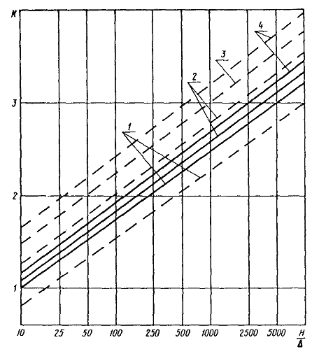 значения коэффициента К определяются по графикам рис. 1, 2 в зависимости от крутизны
