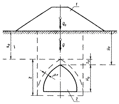 Приложение 9Методика расчета зоны влияния карстовых полостейРасчет зоны безопасности по глубине Расчет выполняется в соответствии с расчетной схемой (рис. 1), исходя из формы карстовой полости в виде полуэллипсоида или эллиптического параболоида, по формулам: у0 = z0 + x0; (1) z0 = z - H - ρt; (2)