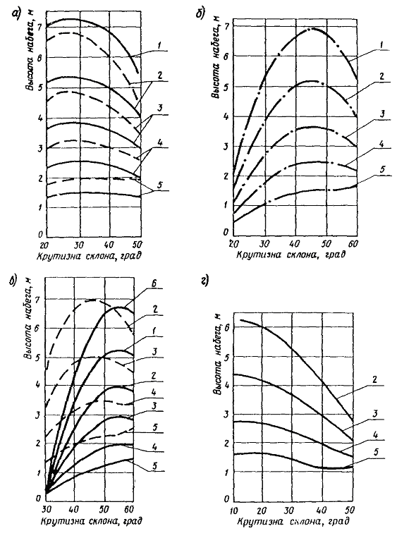 Для построения расчетной траектории камня расчетная скорость определяется по одному из вышеизложенных способов в зависимости от типа склона, а значения угла отражения b находятся по табл. 3. Уравнения расчетных траекторий камней в зависимости от расчетной скорости их υк и угла крутизны склона a сооружения приведены в табл. 6. 4. Определение габаритов улавливающих пазух Габариты улавливающих пазух определяются расчетными отклонениями траектории движения камня ℓmax и аmax, из которых после прибавления технического запаса, принимаемого равным 0,5 - 1,0 м, получаются значения ширины поверху и глубины пазух. После этого осуществляется проверка полученных размеров на выскакивание камня и на емкость пазух. При расчете на выскакивание камня, при трапецеидальной улавливающей пазухе, высота его набега на откос вала или амортизирующей отсыпки определяется по графикам (рис. 4). Расчетное значение угла падения камня на дно пазухи j можно принимать равным углу крутизны склона. При проверке емкости улавливающей пазухи за расчетный удельный объем обваливающейся массы пород принимается 15 м3 на 1 пог. м сооружения. Расчетную площадь поперечного сечения пазухи следует считать от отметки на 1 м ниже верха стены, вала или верхней бровки путевого откоса улавливающего рва с расположением обвалившейся массы в пазухе под углом 20° к горизонту (в сторону склона). В случае, если по условиям проверки на выскакивание камня или проверки на емкость размеры пазухи оказываются недостаточными, то следует их габаритные размеры соответственно увеличить. Рис. 4. Графики для определения высоты набега камней на откос: а, б - крутизной 1:0,75, в - 1:0,5, г - 1:1; сплошные линии - для дна и откоса траншей при ρ = 0,3; λ = 0,3; пунктирные линии - для дна при ρ = 0,50; λ = 0,3 и откоса траншей при ρ = 0,3; λ = 0,3; штрих-пунктирные - для дна при ρ = 0,3; λ = 0,3 и откоса траншеи при ρ = 0,5; λ = 03; 1; 2; 3; 4; 5 и 6 - при скоростях соответственно 35, 30, 25, 20, 15 и 40 м/сек При применении улавливающей пазухи с ломаным очертанием внешнего откоса (рис. 5) размеры отдельных элементов ее поперечного профиля следует назначать по табл. 7. Проверка на выскакивание камня в этом случае не требуется. Проверка емкости осуществляется также, как и для пазухи трапецеидального очертания. Рис. 5. Расчетная схема улавливающей траншеи: 1 - естественная поверхность склона; в, с, h, h0, m, n, - расчетные параметры Таблица 6