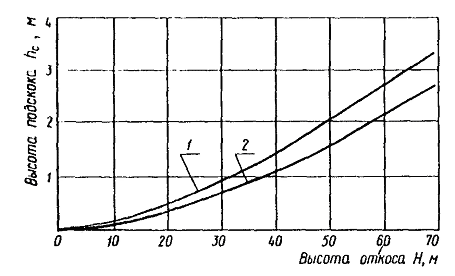 Рис. 2. График для определения высоты подскока камней: 1 - для железных дорог I и II категорий; 2 - для железных дорог III - V категорий и автомобильных дорог Приложение 12Методика расчета на удар одиночным камнем1. Глубина х проникания камня объемом 1 м3 в свежеотсыпанную из грунта амортизирующую подушку определяется по таблице.