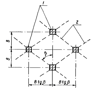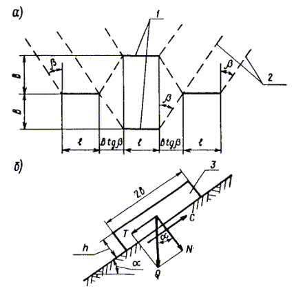 Приложение 15Методика расчета противолавинных сооруженийРасчет сооружений противолавинной защиты производится по расчетным условиям (мощность снежного покрова, объем лавины, дальность выброса ее), вероятность превышения, %, которых принимается равной для: железных и автомобильных дорог I - III категорий, населенных пунктов и крупных зданий - 1; прочих объектов постоянного характера - 2; зданий и сооружений временного характера, требующих устройства противолавинных мероприятий - 3. Удерживающие сооружения с вертикальной или перпендикулярной склону рабочей гранью Количество удерживающих сооружений зависит от площадки лавиносброса, угла наклона склона и прочности снега. Целесообразное размещение сооружений в плане приведено на рис. 1. Длину отдельных секций сооружения ℓ, м, можно определять по формуле