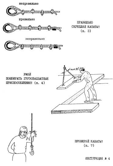 1. К выполнению строповки и увязки грузов допускаются лица не моложе 18 лет после медицинского освидетельствования, прошедшие обучение по учебной программе и инструктажи по безопасности труда, получившие производственную стажировку под руководством опытных стропальщиков и имеющие удостоверение на право производства работ, которое он обязан во время работы иметь при себе. Работать без удостоверения запрещается. 2. Вновь поступающий на работу стропальщик допускается к работе только после прохождения им вводного инструктажа по безопасности труда, пожарной безопасности, производственной санитарии, экологическим требованиям, условиям работы, оказанию доврачебной помощи и первичного инструктажа на рабочем месте. При однообразном характере работы (на том же рабочем месте при выполнении тех же видов работ с использованием того же оборудования, механизмов и т.д.) стропальщик получает повторный инструктаж от руководителя не реже, чем один раз в три месяца. 3. Стропальщик, допущенный к самостоятельной работе, должен: - знать устройство применяемых грузоподъемных механизмов, их грузоподъемность при различных вылетах стрелы; - следить за исправным состоянием стропов и крюков и наличием при каждом из них бирки или клейма с указанием инвентарного номера, допускаемой нагрузки и даты испытания; о каждом замеченном повреждении, а также об отсутствии бирки или клейма стропальщик должен немедленно сообщить мастеру или прорабу; - правильно обвязывать и подвешивать груз на крюк; - правильно укладывать строительные конструкции, оборудование, материалы и детали; - знать способы подъема и опускания грузов ручными и механизированными грузоподъемными приспособлениями на месте монтажа; - знать строповочные узлы и способы крепления стальных канатов болтовыми сжимами;