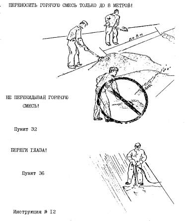 15. Подготовить необходимый для работы инструмент и средства индивидуальной защиты и проверить их исправность. 16. Внимательно осмотреть рабочее место и оградить его типовыми инвентарными ограждениями, конусами, тумбами, штакетными барьерами или сплошными деревянными ограждениями и дорожно-сигнальными переносными знаками. 17. В темное время суток и во время тумана по внешним контурам ограждений и на дорожно-сигнальных знаках вывесить сигнальные красные фонари. 18. Получить задание от бригадира и одеть положенную спецодежду, сигнальные жилеты и индивидуальные средства защиты. 19. При применении такелажных и других приспособлений (блоков, талей, строп) необходимо проверить их исправность и работу проводить только при наличии допуска к стропальным или монтажным работам. 20. При производстве ремонтных работ с использованием передвижных ручных битумных котлов необходимо соблюдать требования инструкции № 9 и следующие требования: - котел нужно устанавливать не ближе 50 м от места работы с учетом преобладающего направления ветра, чтобы предохранить работающих от действия дыма и паров, образующихся при подогреве; - перед разжиганием котла необходимо проверить исправность котла и топки, наличие и исправность инструмента и защитных средств; - разжигать битумоплавильный котел, имеющий неисправности, запрещено; - прикасаться руками без рукавиц к крышке битумного котла запрещается. 21. Загружать битум в котел следует небольшими кусками во избежание разбрызгивания; чтобы не допустить вытекание битума в случае его вспенивания, котел нельзя загружать больше, чем на 2/3 его емкости. 22. При разжигании котла запрещается применять бензин, керосин и другие быстровоспламеняющиеся вещества. Огонь в топке следует увеличивать постепенно, обеспечивая медленное плавление битума. 23. Загружаемый битум не должен содержать воды и грязи - присутствие в битуме воды при его плавлении вызывает вспенивание битума и может повлечь вытекание его из котла. Для прекращения вспенивания битума следует применять специальный препарат СКТН-1 (Синтетический каучук тиоколовый низкомолекулярный). При введении этого препарата в горячий битум в количестве двух капель вспенивание прекращается. При отсутствии указанного препарата в случае вспенивания необходимо интенсивно перемешивать битум веслом, не допуская проникновения его в топку. Если уменьшить вспенивание перемешиванием не удается, необходимо отлить специальным черпаком на длинной ручке часть битума в запасную емкость, закрываемую крышкой. 24. Во избежание попадания воды и вспенивания битума необходимо во время дождя горловину котла закрывать несгораемой крышкой. 25. При возгорании битума в топке или котле необходимо закрыть дверцу топки или крышку котла и гасить огонь песком или грунтом. Применять воду для тушения запрещается. 26. Добавлять битум в разжижитель (керосин) разрешается только при погашенном огне в топке. 27. Переносить разогретый или разжиженный битум разрешается только в специальных конусообразных ведрах, оборудованных крышками. Наполнять ведра следует только специальным черпаком и лишь на 3/4 их высоты во избежание выплескивания горячего битума при переноске. 28. При доставке асфальтобетонных, цементобетонных, щебеночных, песчано-гравийных смесей, щебня, гравия и других материалов к мест