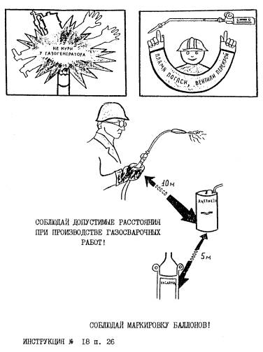 1. К выполнению газосварочных работ допускаются лица не моложе 18 лет, признанные годными к данной работе медицинской комиссией, прошедшие специальное обучение безопасным методам и приемам производства работ и инструктажи по безопасности труда и имеющие квалификационное удостоверение. 2. Поступающий на работу должен пройти вводный инструктаж по безопасности труда, производственной санитарии, оказанию доврачебной помощи, пожарной безопасности, экологическим требованиям, условиям работы и первичный инструктаж на рабочем месте, о чем должны быть сделаны записи в соответствующих журналах с обязательной подписью инструктируемого и инструктирующего, другие виды инструктажа, а также ежегодную проверку знаний требований безопасности. 3. Выполнять только ту работу, которая разрешена администрацией, и при условии, что безопасные способы ее выполнения известны. 4. Выполняя газосварочные работы, необходимо пользоваться соответствующей спецодеждой: хлопчатобумажным костюмом с огнестойкой пропиткой, рукавицами брезентовыми, кожаными ботинками. При ручной сварке, газовой строжке, газовой выплавке пороков металла и при нагреве изделий следует пользоваться защитными очками закрытого типа. 5. Необходимо быть осторожным около тросов, цепей канатов. 6. Не допускается наступать на крышки люков и разные перекрытия ям, канав и котлованов во избежание падения в них. 7. Стоять под поднятым грузом, а также под настилами лесов или в местах, где возможно падение разных предметов, запрещается. 8. Курить вблизи ацетиленового (газосварочного) аппарата или подходить к нему с огнем запрещается, так как это может вызвать взрыв. 9. Не допускается попадания на кислородные баллоны масла; запрещается прикасаться к ним загрязненными маслом руками, так как даже незначительное количество масла (жира) в соединении с кислородом может вызвать взрыв большой разрушительной силы. 10. Запрещается: - включать или останавливать (кроме аварийных случаев) машины, станки и механизмы, работа на которых не поручена администрацией; - прикасаться к электрооборудованию; электрораспределительным щиткам, арматуре общего освещения, электропроводам (особенно оборванным), клеммам и другим токоведущим частям; - самому устранять неисправности в электрооборудовании (это должен делать электромонтер). 11. На каждом газосварочном аппарате должны быть четко обозначены регистрационный заводской номер, наименование предприятия, выпустившего газосварочный аппарат и даты ежегодных проверок. 12. Каждый газосварщик имеет право работать на газосварочном аппарате, выданном ему и числящемся за ним. Передавать газосварочный аппарат, резаки, горелки, редукторы, шланги другим лицам запрещается. Работать на газосварочном аппарате кустарного типа запрещается. 13. При обслуживании газосварочного аппарата пользоваться стальным инструментом запрещается. Для вскрытия барабанов с карбидом кальция необходимо применять специальные ножи, изготовленные из неискрящихся при ударах и трении материалов. 14. Вскрытые, но не полностью использованные барабаны с карбидом кальция необходимо закрывать крышками, обеспечивающими герметизацию.