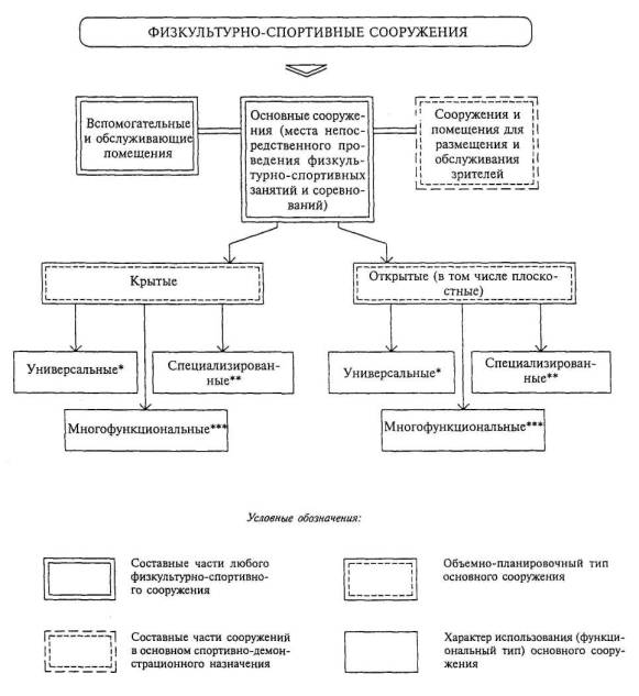 * Универсальные - сооружения, попеременно используемые для разных видов физкультурно-спортивных занятий и соревнований при значительной трансформации места их проведения.