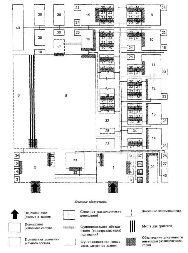 ФУНКЦИОНАЛЬНО-ПЛАНИРОВОЧНАЯ СХЕМА КОРПУСА СПОРТИВНЫХ ЗАЛОВ, В ТОМ ЧИСЛЕ ДОСТУПНЫХ ДЛЯ ИНВАЛИДОВ |