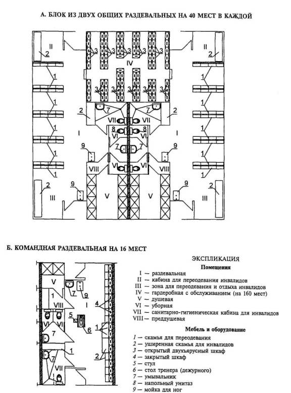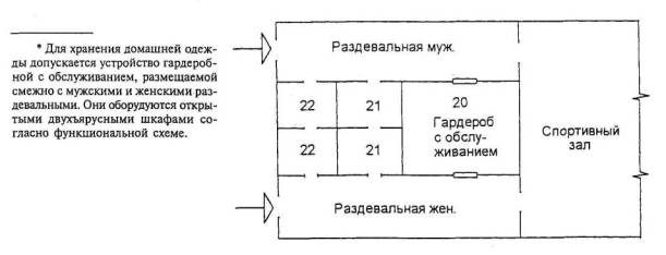 20. Общие (для мужчин и женщин) раздевальные с хранением домашней одежды в помещениях для переодевания в закрытых двухъярусных шкафах* |