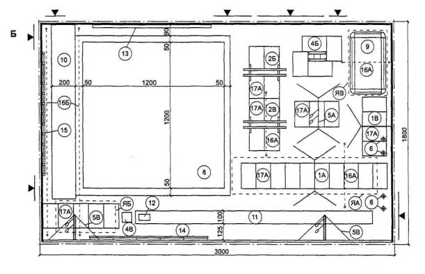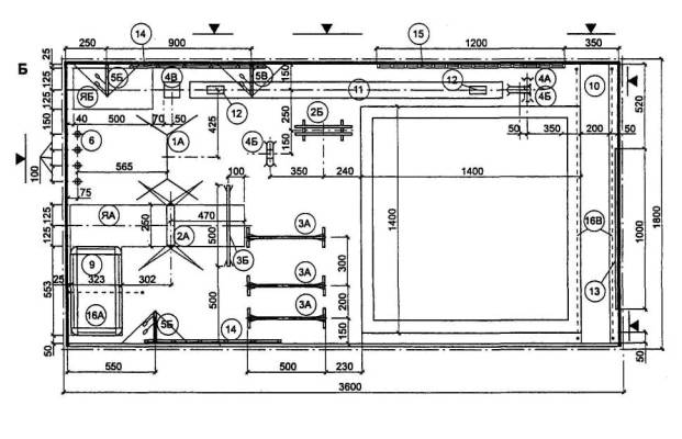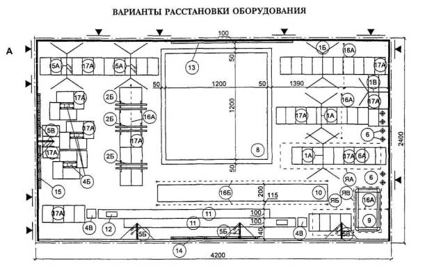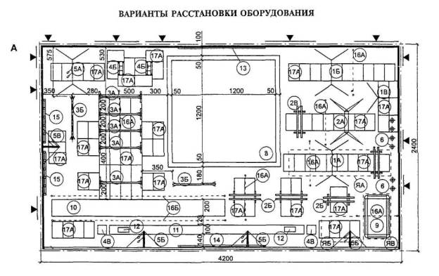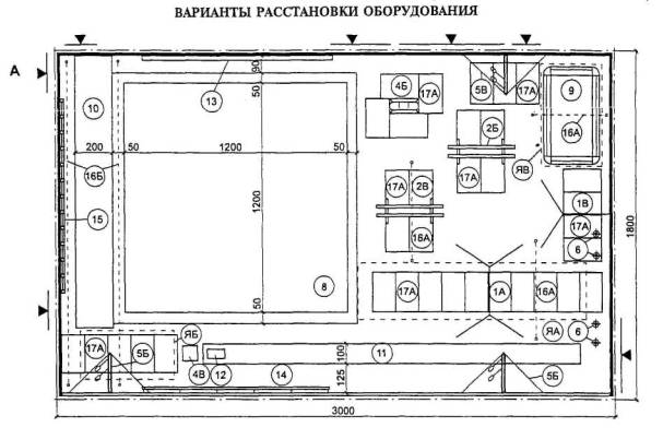 На чертежах оборудования указаны основные габаритные размеры, а на общих планах и на схемах планировочных узлов - размеры элементов оборудования и отдельные твердо установленные параметры, а также минимальные со знаком «³» расстояния между предметами оборудования и ширина проходов.