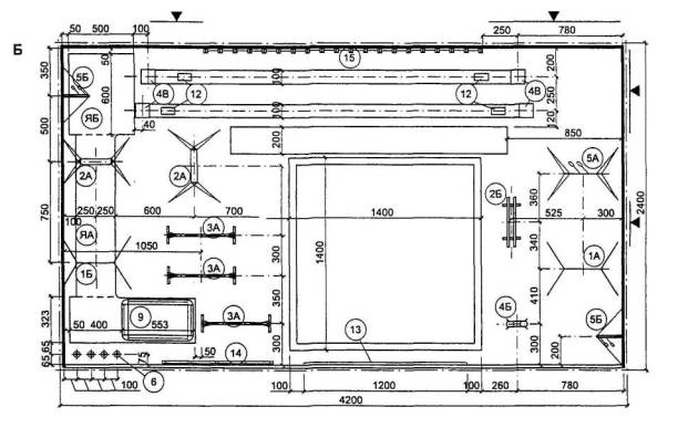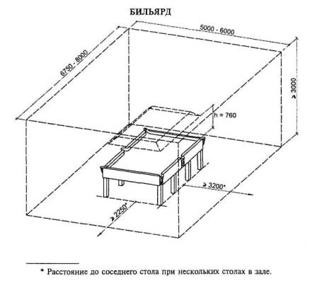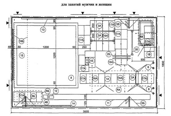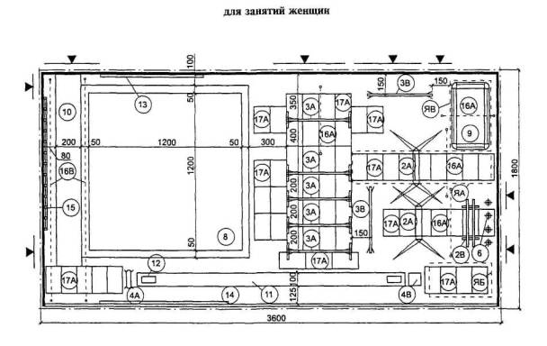 4.6.20 Места для зрителей, если они предусматриваются заданием на проектирование, должны располагаться с трех сторон стола за пределами игровой зоны, т.е. на расстоянии 1,6 - 2 м от стола. Для лучшего наблюдения за игрой они должны быть приподняты. Места для зрителей могут быть постоянными или трансформируемыми. 4.6.21 Игра требует сосредоточенности и концентрации внимания игроков, поэтому бильярдная нуждается в изоляции от наружного шума. 4.6.22 При включении бильярдной в другие сооружения игроки пользуются общими вспомогательными помещениями. Для бильярдных клубов, особенно отдельно стоящих сооружений, требуются раздевальные, душевые, туалеты, мастерская, комната отдыха, кафе-бар, клубные помещения, помещения для администрации, для собраний членов клуба и прочее (рисунок 4.59). Помещения аэробики и атлетической гимнастики 4.6.23 Планировочные параметры спортивных залов атлетической гимнастики, индивидуальных занятий аэробикой с использованием техники, шейпинга, кардиозалов, помещений индивидуальной силовой подготовки не нормируются. Допускается их размещение в помещениях произвольной формы, а также в помещениях с сеткой промежуточных опор не менее 6´6 м. 4.6.24 Площади залов атлетической гимнастики, индивидуальных занятий аэробикой с использованием тренажерной техники, шейпинга, кардиозалов, помещений индивидуальной силовой подготовки, приведенные в таблице 4.11, составленной по материалам пособия к МГСН 4.08, являются минимальными и могут быть увеличены заданием на проектирование с учетом принятой единовременной пропускной способности, уровня комфортности и принятого состава оборудования (из расчета 4,5 м2 на 1 тренажер). Таблица 4.11 - Рекомендуемые габариты и площади помещений физкультурно-оздоровительного назначения