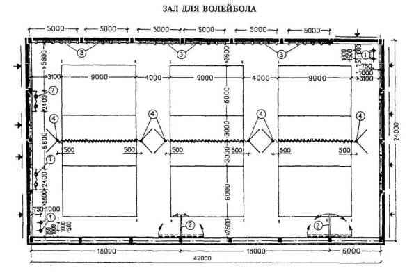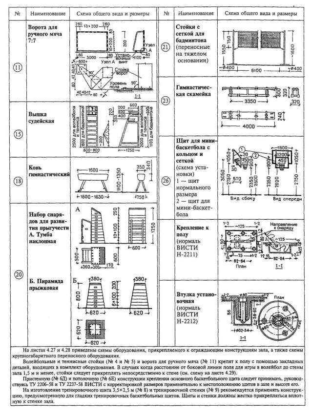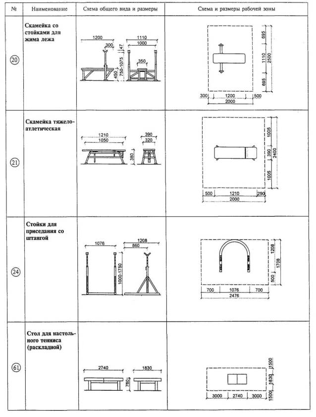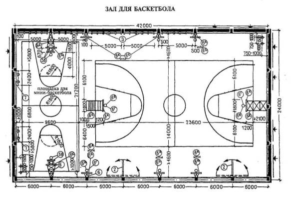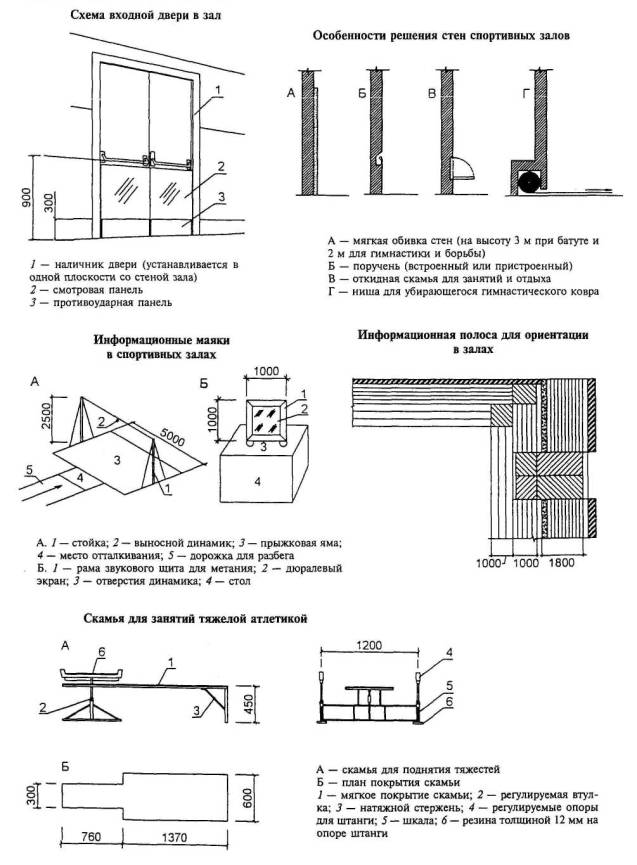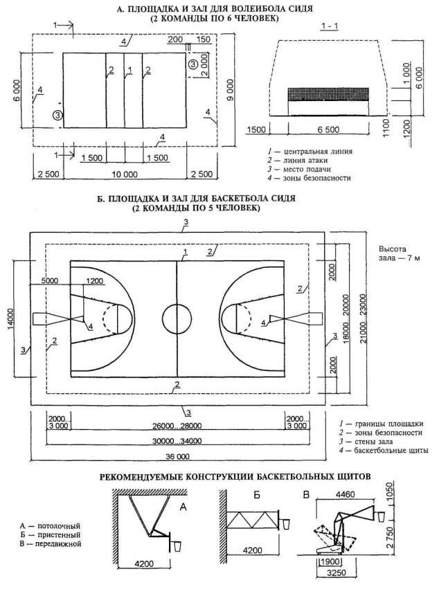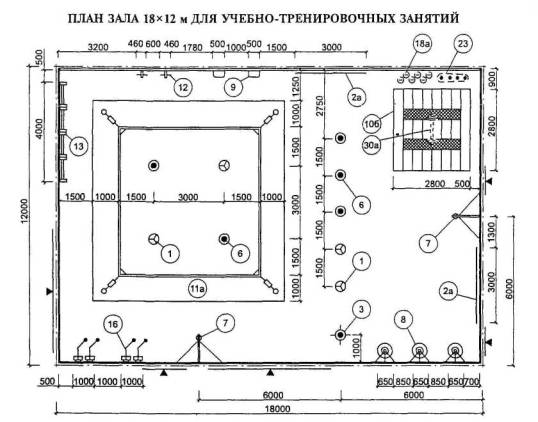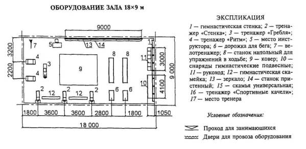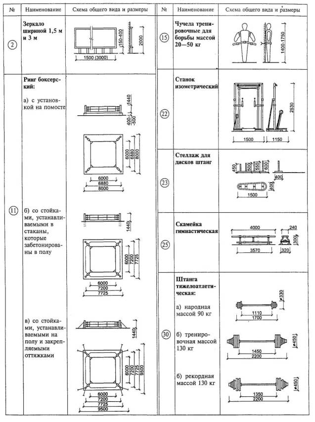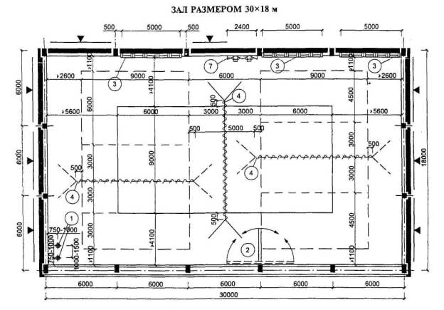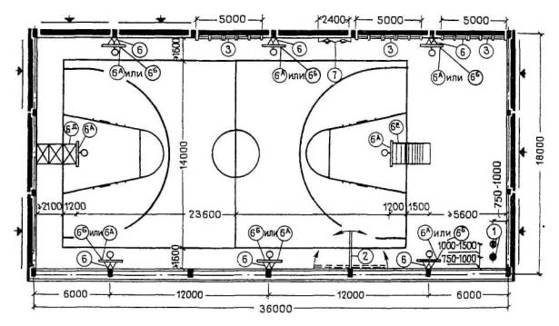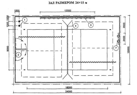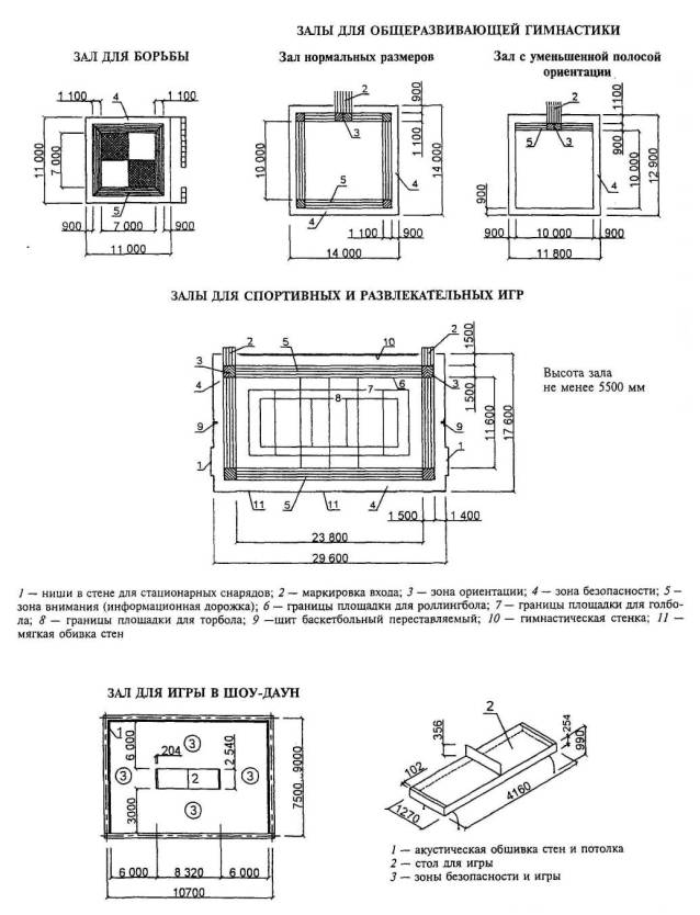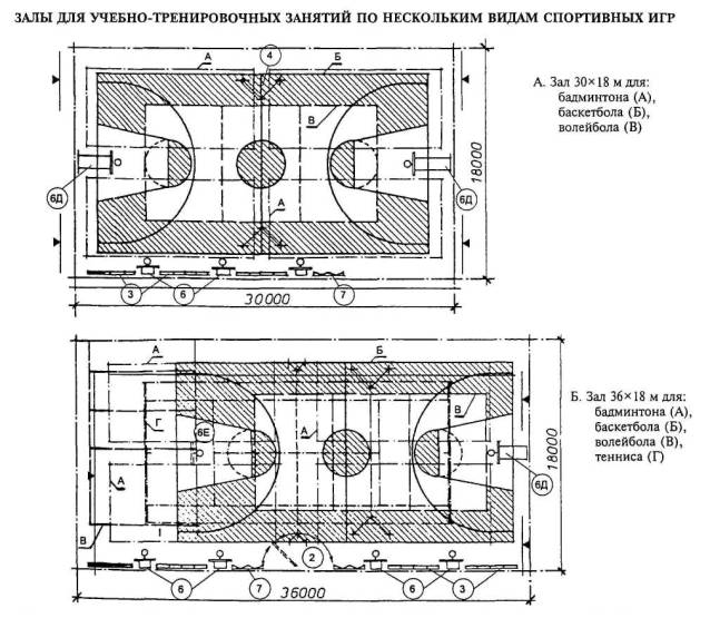 Расстановка оборудования во всех залах, разметка полей для спортивных игр, а также состав и количество оборудования приведены для залов без балконов или трибун для зрителей (трибуны можно предусматривать только за пределами указанных габаритов залов).