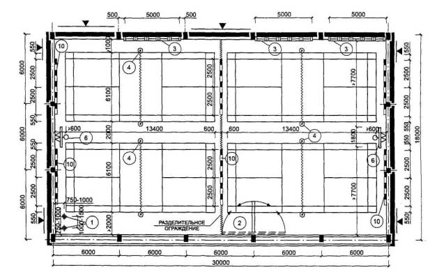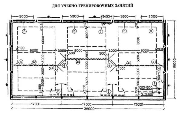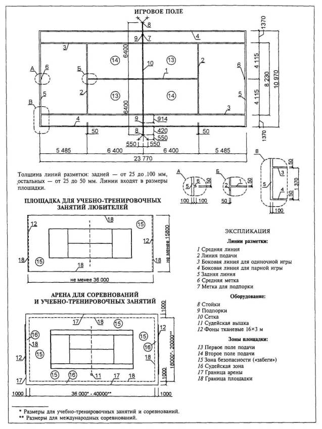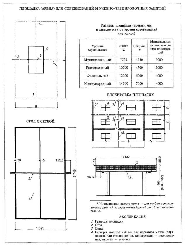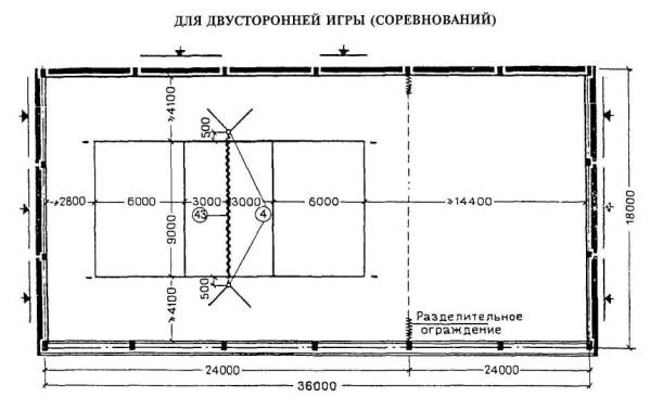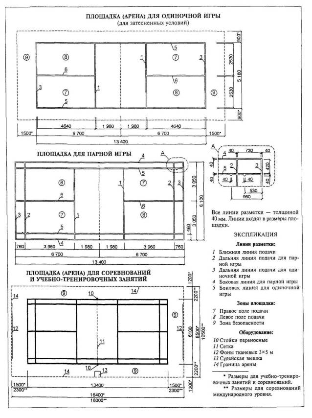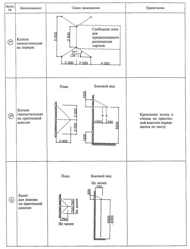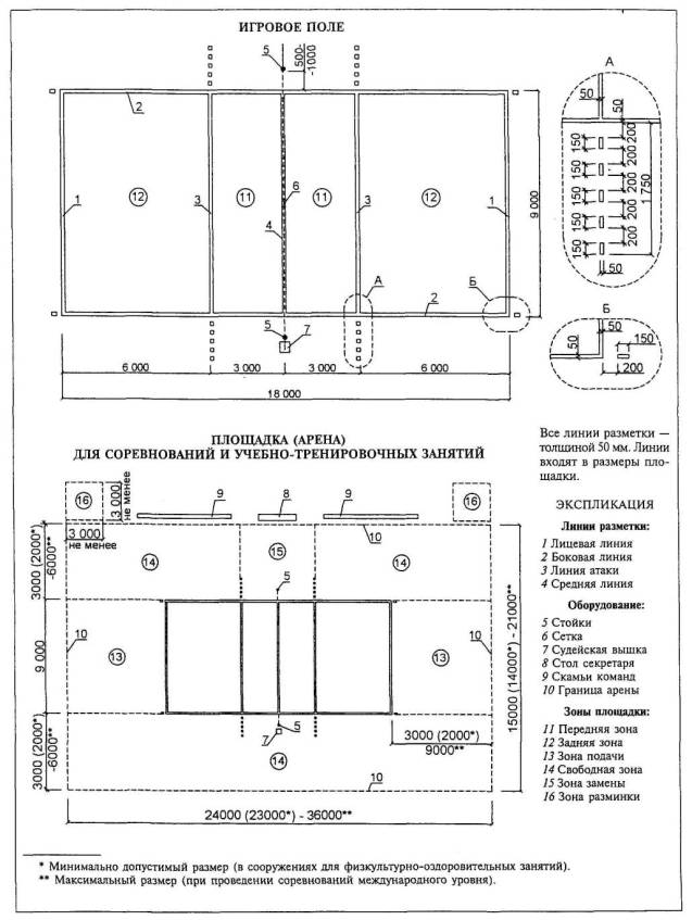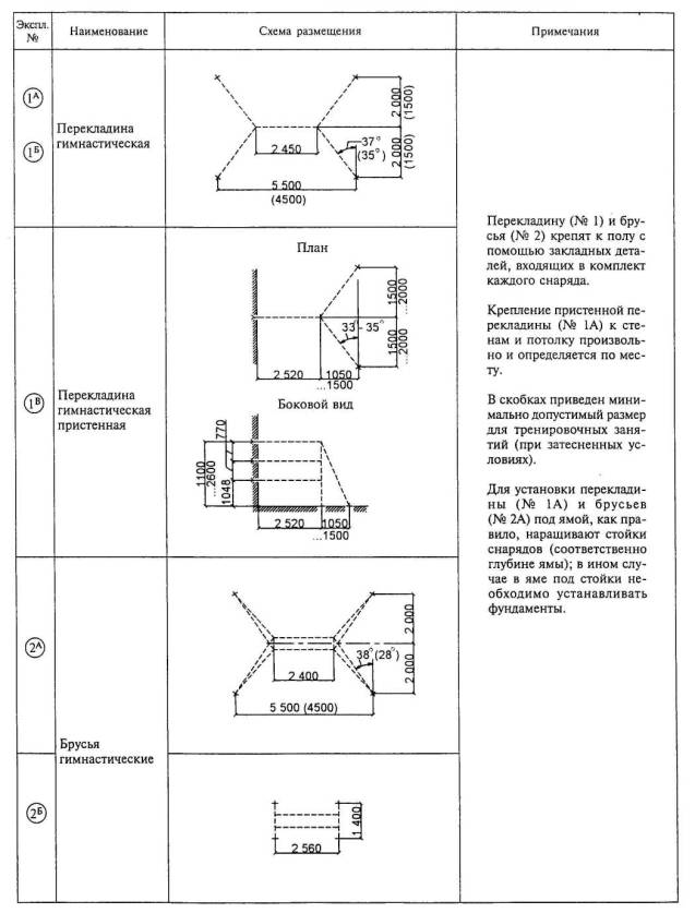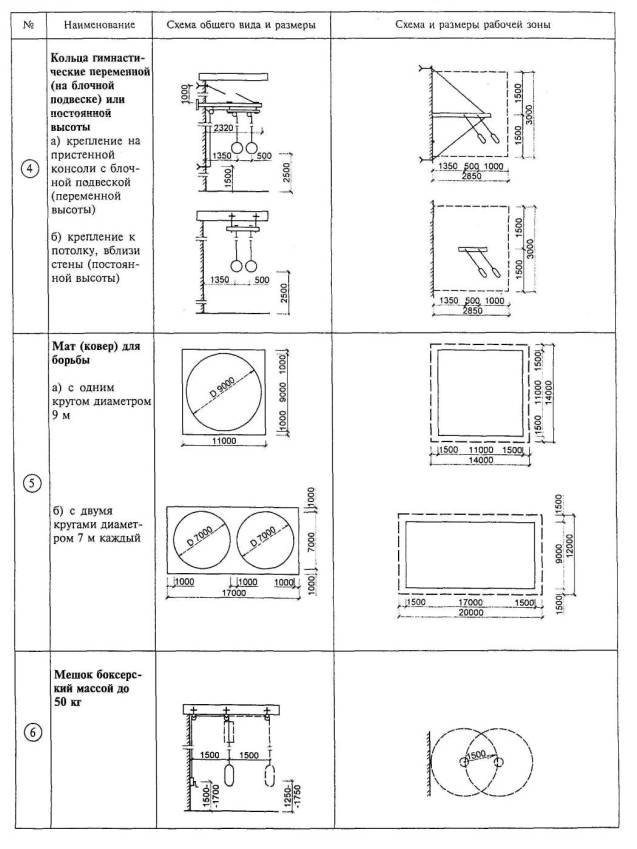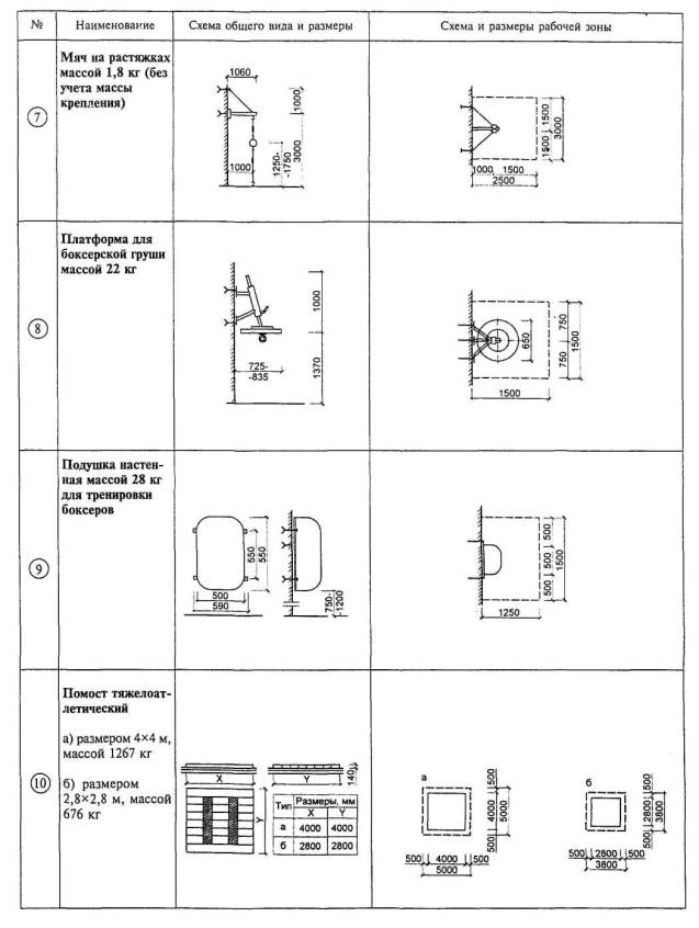Расстановка оборудования во всех залах, разметка полей для спортивных игр, а также состав и количество оборудования приведены для залов без балконов или трибун для зрителей (трибуны можно предусматривать только за пределами указанных габаритов залов).