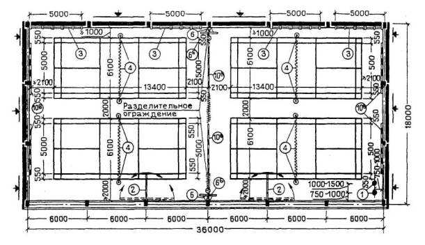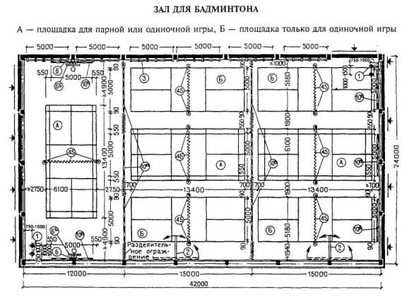 Габаритные схемы и спецификацию оборудования и инвентаря, а также его установки даются на рисунках 4.29 - 4.30. Табель-экспликацию оборудования и инвентаря см. в приложениях В и Г. 4.2.4 При одновременном размещении в зале нескольких площадок для одного вида спортивной игры количество инвентаря не увеличивается пропорционально числу площадок, а принимается применительно к табелю на одну площадку исходя из общей площади зала и его пропускной способности (по указанному принципу принят табель для залов 30´18 и 36´18 м). Так же в каждом отдельном случае определяется количество оборудования и инвентаря для залов, площадь которых превышает размеры площадки. 4.2.5 В зале 30´18 м (рисунок 4.28,А), если он предназначен и для баскетбола, и для бадминтона, устанавливаются основные баскетбольные щиты с соответствующим креплением, а тренировочные щиты не предусматриваются. В зале 36´18 м для учебно-тренировочных занятий (рисунок 4.25) в связи с небольшим расстоянием от боковых линий учебных площадок для волейбола до торцевой стены зала стойки устанавливают не на растяжках, а прикрепляют непосредственно к стене и при трансформации не убирают. В залах 36´18 м (рисунок 4.28), специализированных только для тенниса, тренировочную стенку рекомендуется размещать по обеим торцевым стенам зала, кроме того, в зале для тенниса все пролеты гимнастической стенки следует располагать вместе - на середине продольной стены зала. 4.2.6 Гимнастические стенки, тренировочные щиты для ручного мяча, стенки для тенниса и ромбические щиты при размещении их по продольным стенам зала необходимо располагать на стенах, не имеющих оконных проемов, или с проемами, низ которых расположен на высоте не менее 4,5 м от пола. 4.2.7 При размещении в зале нескольких площадок между ними следует, как правило, предусматривать съемные (раздвижные) разделительные устройства произвольной конструкции для задержки мяча. Разделительные устройства, а также переносные барьеры для площадок настольного тенниса не включены в табель-экспликацию оборудования и инвентаря. 4.2.8 Для бадминтона и тенниса в торцах полей для игры должны предусматриваться фоны из материи темного цвета. Кроме того, для тенниса предусматривается тренировочная (отбойная) стенка высотой 3 м, а для гандбола - тренировочный настенный щит высотой 2,5 м и шириной 3,5 м. 4.2.9 Места для зрителей, стационарные или временные, нужно располагать так, чтобы расстояние от боковых и лицевых (задних) линий разметки поля для игры до первого ряда зрителей было бы не менее 3 м для волейбола и не менее 2 м для бадминтона, баскетбола и ручного мяча. На площадках для тенниса расстояние до зрителей от задних линий разметки поля для игры должно быть не менее 6 м, а от боковых - не менее 3,5 м, а при соревнованиях высокого масштаба - соответственно не менее 8 и 4,5 м. В целях более рационального размещения таких мест по периметру площадки рекомендуется в зале 36´18 м дополнительно предусматривать разметку одной площадки для соревнований по волейболу и одной - по бадминтону (в центре зала по его продольной оси). 4.2.10 При проектировании залов с балконами для зрителей низ конструкции балконов должен быть на отметке не менее 3,7 м от поверхности пола зала; в этом случае крепить баскетбольные щиты нужно к конструкции балкона. В залах 30´18 и 36´18м балкон рекомендуется предусматривать только 