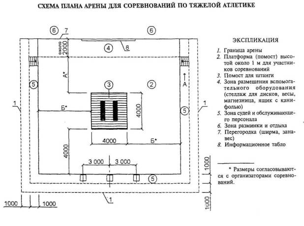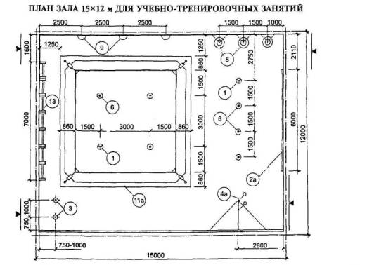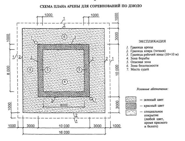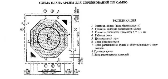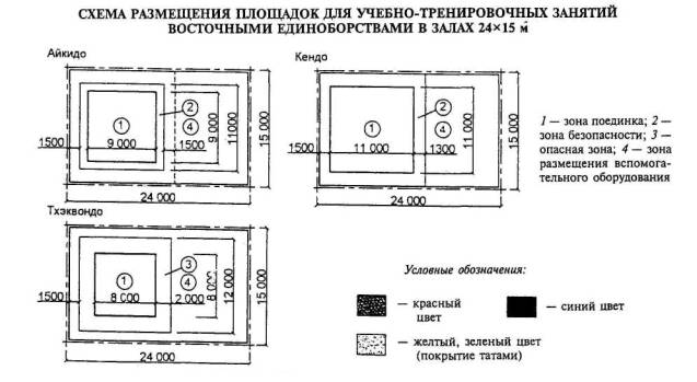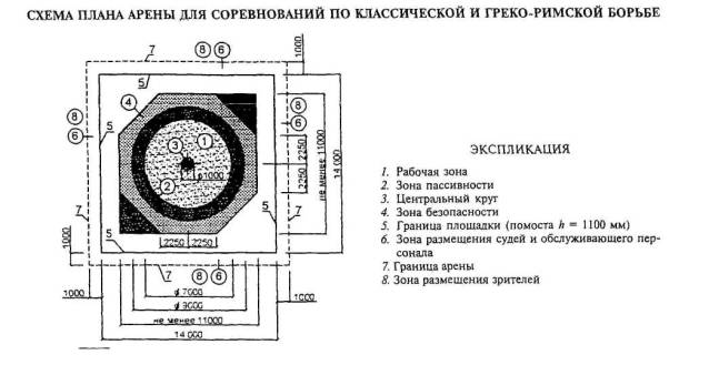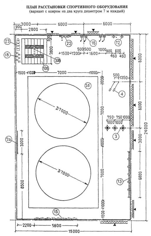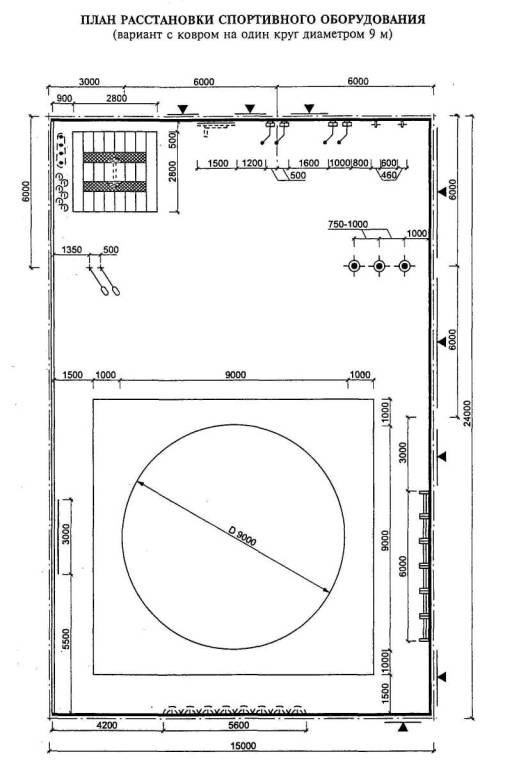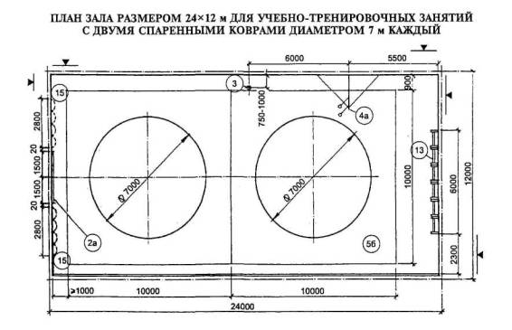 Примечание - В связи с размещением в зале ковров минимально допустимого размера (диаметр 7 м) рекомендуется использовать его для начинающих спортсменов и борцов младших разрядов.