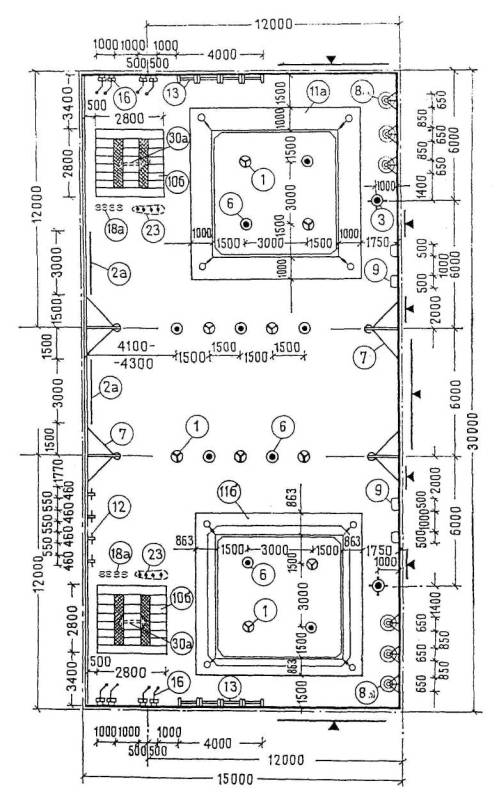 На планах расстановки оборудования в залах для гимнастики и для спортивных игр отсчет размеров принят от внутренней поверхности стен с привязкой их к строительным осям, равной 40 см. При иной привязке размеры, показанные со знаком «³», должны быть соответственно откорректированы. Стены на чертежах залов для гимнастики показаны из кирпича, а залов для спортивных игр - в каркасно-панельной конструкции.