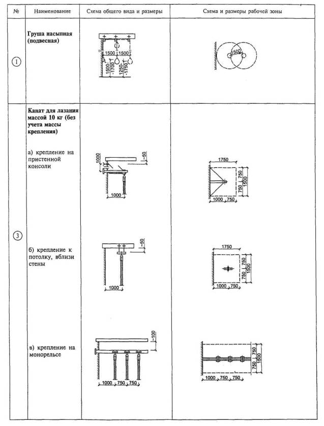 4.4.13. Залы для физкультурно-оздоровительных занятий могут быть как специализированными, так и универсальными. В специализированных залах оборудование стационарное, в универсальных - трансформируемое. При помещениях для физкультурно-оздоровительных занятий для хранения переносного оборудования и инвентаря предусматриваются инвентарные. При помещениях для групповых занятий по общей физической подготовке (включая игры с мячом) размером 24´12 м и 18´12 м площадь инвентарной рекомендуется 18 м2 (6´3 м), а при размере помещения 18´9 м - 15 м2 (6´2,5 м). В случаях применения в этих помещениях пристенного трансформируемого оборудования, а также при остальных помещениях, приведенных в таблице 4.3 (кроме помещения для настольного тенниса), площадь инвентарной рекомендуется 8 м2. 4.4.14 Независимо от специализации в группе физкультурно-оздоровительных занятий на 1 тренера приходится 20 - 25 человек. В случае занятий пожилых и ослабленных людей группа может быть сокращена до 12 - 15 человек, 4.4.15 Площади раздевальных для занимающихся с хранением домашней одежды в помещении раздевальной в закрытых шкафах определяются в соответствии с рекомендациями раздела 5. Возможно предусматривать хранение домашней одежды для занимающихся открытым способом (на крючках); в этом случае над скамьями для переодевания (0,6 м на каждое место) устанавливаются по 2 крючка. При расположении массажной при раздевальных для занимающихся отдельные раздевальные и душевые при массажной не предусматриваются. 4.4.16 Если помещения для физкультурно-оздоровительных занятий встроены в жилые дома, то душевые для занимающихся могут не предусматриваться, а санитарные узлы, как правило, предусматриваются общими для муж чин и женщин и оборудуются одним унитазом и одним умывальником. 4.4.17 Ограждающие и несущие конструкции, а также полы помещений и залов для физкультурно-оздоровительных занятий должны допускать возможность крепления к ним стационарного и переносного спортивного оборудования (рисунок 4.50). 4.5 Залы, приспособленные для занятий инвалидов4.5.1 При периодическом использовании физкультурно-спортивных залов и помещений для инвалидов в проектируемых зданиях кроме учета положений по доступности (СНиП 35-01 и своды правил к нему) следует учитывать размеры специализированных площадок для занятий инвалидов, размещаемых в залах стандартных размеров. Виды спортивных и развлекательных игр для инвалидов приведены в приложении Е. 4.5.2 В дополнение к типовому набору оборудования и инвентаря в залах следует учитывать дополнительное оборудование для занятий инвалидов. При расстановке оборудования и тренажеров следует учитывать зоны безопасности и подъезды для инвалидов на колясках. 4.5.3 Размеры и пропускную способность спортивных площадок, специализированных по отдельным видам спорта для инвалидов, следует принимать согласно таблице 4.4. Таблица 4.4