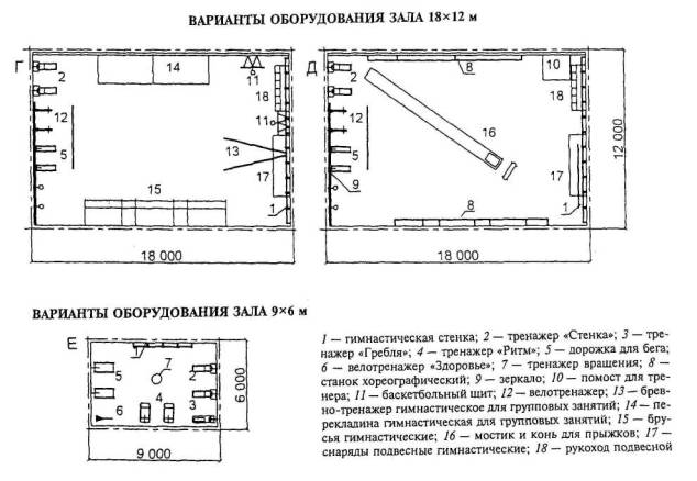 4.4.4 Примеры схем планов и расстановки оборудования в помещениях и залах для физкультурно-оздоровительных занятий приведены на рисунках 4.47, 4.48. 4.4.5 Использование зала находится в зависимости от расстановки оборудования и степени его трансформации: - зал для ОФП с элементами игр предназначен для комплексных занятий, сочетающих в разных для каждой возрастной группы пропорциях общеразвивающие упражнения, элементы игровых видов, упражнения на гимнастических снарядах и тренажерах. Универсальность зала достигается применением съемного трансформируемого оборудования; - зал для ОФП без элементов игр, предназначенный для основной гимнастики, оснащается гимнастическими снарядами и тренажерами. Применяя трансформируемое оборудование, можно использовать свободную зону зала для общеразвивающих упражнений; - залы для подвижных и спортивных игр могут быть меньше, чем для спортивных занятий игровыми видами, где действуют жесткие правила соревнований. В игровых залах чаще всего используются оборудование и разметка площадок для спортивных игр - волейбола, бадминтона, баскетбола, гандбола, тенниса. 4.4.6 Крупные универсальные залы, предназначенные для физкультурно-оздоровительных занятий и тренировок, могут быть использованы: - зал 36´18 м, включенный в состав физкультурно-оздоровительных центров для районов с численностью населения 30,0 - 50,0 тыс. чел., - для бадминтона, волейбола, баскетбола, тенниса; - зал 45´24 м, включенный в состав физкультурно-оздоровительных центров для районов с численностью населения более 50,0 тыс. чел., - для бадминтона, волейбола, баскетбола, тенниса, ручного мяча. Рекомендуется также использование универсальных залов для новых, развивающихся видов игр - флорбола, футзала. 4.4.7 Площадь на одного занимающегося: в зале ОФП с элементами игр и в игровом зале - 11,5 м2, в зале без элементов игр - 8,5 м2. При залах ОФП для увеличения возможности использования зала необходима инвентарная комната (ориентировочно 3´6 м), где хранятся съемные гимнастические снаряды, тренажеры, мелкий инвентарь. 4.4.8 Залы для ритмической, женской гимнастики и хореографии имеют размеры 9´9 м, 12´12 м, 15´12 м, 18´12 м при оптимальной высоте 4 - 5 м. Площадь на одного занимающегося 5,5 м2. В комплект оборудования входят хореографический станок с зеркалами, гимнастические стенки, подиум для преподавателя (стационарный, откидной или переносный), вдоль стенки возможно размещение общеразвивающих тренажеров. Габариты многофункциональных залов фитнес-центров, используемых в попеременном режиме для групповых занятий аэробикой и спортивных игр (или их элементов), могут уточняться в задании на проектирование с учетом занятий, предусмотренных для проведения в зале. 4.4.9 Если нет специализированного зала настольного тенниса, то занятия можно проводить в вестибюле, фойе, холле. Минимальная площадь зоны на один стол - 6´4 м при высоте помещения не менее 3 м в чистоте. 4.4.10 Для общефизической подготовки спортсменов и при физкультурно-оздоровительных занятиях применяются тренажеры, различные конструктивные устройства и механические подвижные приспособления, предназначаемые для развития и укрепления групп мышц, развития ловкости, координации движений и т.д. Аналогичные по функциональному назначению типы тренажеров имеют разнообразные конструктивно-механические решения, разл