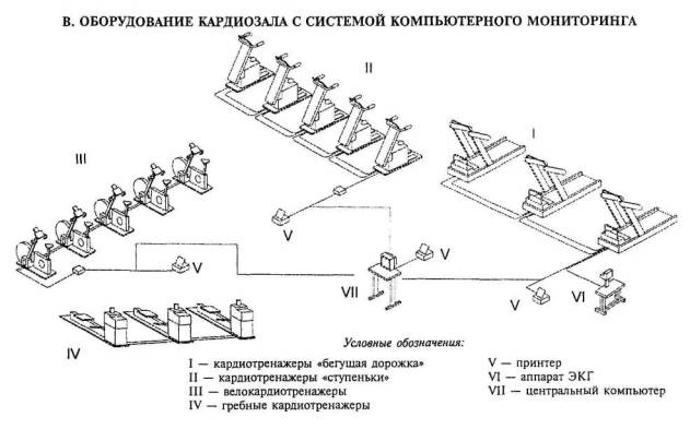 4.6.25 Залы аэробики предназначены для групповых занятий различными видами оздоровительной аэробики (фитнес-аэробика), в том числе классической танцевальной аэробикой, упражнениями с использованием различных устройств, предметов и приспособлений (слайд-аэробики, степ-аэробики, фитбол-аэробики, тераэробики, памп-аэробики), аэробики с элементами боевых искусств. 4.6.26 В залах групповых занятий аэробикой следует предусматривать хореографический станок, зеркала (по фронту групповых занятий), шведскую стенку, устройства для музыкального сопровождения, стеллажи для переносного оборудования. Размер свободной площадки для групповых занятий (в том числе занятий в партере) следует определять с учетом численности группы из расчета не менее 4,5 м2 на человека. Схема размещения оборудования в зале аэробики размером 18´18 м приведена на рисунке 4.46. 4.6.27 Состав дополнительного оборудования зала аэробики следует определять в задании на проектирование с учетом перечня видов занятий, осуществляемых в зале. В качестве дополнительного спортивного оборудования в залах аэробики рекомендуется предусматривать: при занятиях памп-аэробикой - оборудование, используемое для поднятия тяжестей, в том числе гантели, гири, штанги, помосты, скамьи со стойками для жима лежа, стойки для приседания со штангой. Допускается также предусматривать отдельное помещение для силовой подготовки с помостом для поднятия тяжестей площадью от 72 м2: - при занятиях аэробикой с использованием элементов боевых искусств - подушки на стенах (макивара), боксерские мешки, боксерские груши набивные и пневматические на платформе; - при занятиях сайкл-аэробикой - комплект велотренажеров в количестве, равном численности группы. 4.6.28 В составе фитнес-центров предусматриваются кардиозалы, предназначенные для индивидуальных занятий аэробикой, с целью развития сердечно-сосудистой и дыхательной систем. Они оборудуются комплектом кардиотренажеров различных типов (в том числе «бегущие дорожки», «степ»-тренажеры, велотренажеры, гребные тренажеры). При оборудовании кардиозала тренажерами с системой компьютерного мониторинга тренировочного процесса следует предусматривать в зале место оператора системы компьютерного мониторинга площадью от 4,5 м2 или отдельное помещение площадью от 6,0 м2. Схема комплектации оборудования кардиозала кардиотренажерами при организации автоматизированного централизованного мониторинга занятий представлена на рисунке 4.47. 4.6.29 Залы атлетической гимнастики (бодибилдинга) следует оборудовать тренажерами для развития различных групп мышц, оборудованием для поднятия тяжестей, в том числе гантелями, гирями, штангами, помостами для поднятия тяжестей, скамьями со стойками для жима лежа, стойками для приседания со штангой. Состав оборудования определяется заданием на проектирование с учетом программ занятий посетителей клуба. 4.6.30 При включении в программы занятий бодибилдингом упражнений с использованием гимнастического оборудования - брусьев, перекладин, канатов для лазания - рекомендуется дополнительно к залу атлетической гимнастики предусмотреть зал ОФП размером 18´9 м, высотой 6 м. Размещение гимнастического оборудования в зале атлетической гимнастики допускается при необходимости при соответствующем увеличении площади и высоты зала. 4.7 Инвента