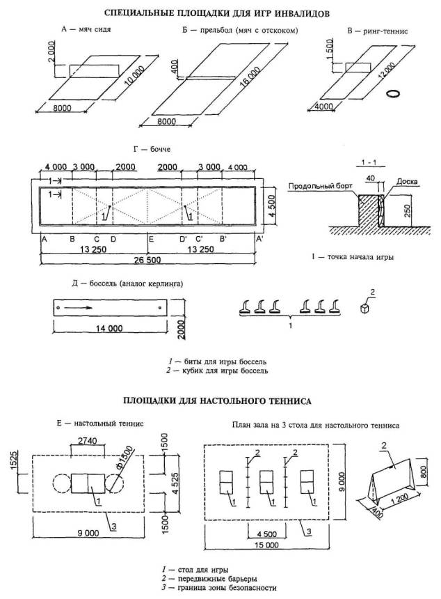 Приложение Е(справочное)Виды спортивных и развлекательных игр для инвалидовБадминтон - играют по обычным правилам на площадке 13´5 м, сетка на высоте 1,5 м, две команды по 1-2 человека. Аналогичны правила игры в «теннис индиака», только здесь мяч из пластмассы с оперением перебрасывается через сетку теннисными ракетками (для настольного тенниса). Баскетбол сидя - для инвалидов с ПОДА представляет два дополнительных требования к размеру и оборудованию: - площадки обычного размера; должны быть зоны безопасности 2 м со всех сторон, а в торцах лучше 3 м. Соответственно минимальный размер площадки с зонами безопасности 32´16 м, а зала с учетом модульных размеров - 36´18 м.; - корзина может быть на консольной опоре, когда основание опоры остается вне 3 м зоны безопасности. Опоры должны иметь мягкую защитную обшивку. Предпочтительнее крепление щитов к стене или потолку. Команда состоит из 5 человек. Размер площадки 25,6´15,24 м (рисунок 4.51, схема Б). Бочче - игра в шары для инвалидов с ПОДА. Цель игры - бросить (катнуть) шар, чтобы он остановился как можно ближе к шару меньшего размера, постоянно установленному на середине площадки для игры (рисунок 4.53, схема Г). Боссель - игра в зале, аналог керлинга. Пол в зале должен быть идеально гладким. Правила игры напоминают бочче. В игре - 2 комплекта по 3 специальных биты на щетках и кубик. Игра идет на поле 12´16 м (рисунок 4.53, схема Д). Волейбол сидя - для инвалидов с ПОДА. В момент игры на площадке находятся 6 человек. Играют сидя на полу без протезов (рисунок 4.51, схема А). Размеры площадки: длина 10 м, ширина 6 м, высота сетки от пола у мужчин - 120 см, у женщин - 110 см, атакующая линия - 1,5 м от центральной линии, разделяющей поле пополам. Разметка площадки на рисунке 3. Длина сетки 6,5 м, ширина 1 м. Гандбол через сетку - играют инвалиды-ампутанты - 2 команды по 6-10 человек, поле 30´10 м, сетка (шнур) на высоте 1,8-2 м от пола. Перед сеткой - зона 2 м, в которую нельзя заступать. «Воротами» является вся зона в торцах площадки, а верхняя граница «ворот» - шнур на высоте 2,4 м от пола. Голбол - имеет определенные отличия от роллингбола, он намного динамичнее, быстрее. В этой игре могут участвовать абсолютно слепые спортсмены. Команда состоит из 3 игроков. Защитники и вратарь являются одновременно и нападающими. Цель игры - забросить мяч в ворота противника (мяч должен катиться по полу). Площадка для игры имеет размер 18´9 м. Ворота расположены вдоль лицевой линии. Опорные стойки круглой формы, подбитые войлоком, устанавливаются в крайних точках лицевой линии (h=1,3 м). Перекладина закреплена. Мяч - медицинбол. Площадка делится на 3 сектора по 6 м и центральной линией на 2 части по 9 м. Каждая половина площадки в свою очередь разбивается на три зоны: защиты, нападения, среднюю. В зоне защиты игроки располагаются вдоль линии ворот на специальных ориентировочных матах (1,5´2´0,02 м). Зона нападения - 3 м. Все обозначения, линии ограничения должны быть шириной 5 см и иметь контрастную поверхность с полом, особенно в секторе команды, чтобы игроки имели возможность легко, на ощупь ориентироваться на игровом поле. Размер зала с учетом зон ориентации и безопасности - 18´30 м (рисунок 4.52, схема Б). Квад-регби - уникальная спортивная игра для квадроплегиков. Играется на баскетбольной площадке, две команды по 4 человека. Цель игры - перенести мяч через линию ворот противника. В кегли могут иг