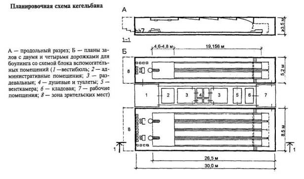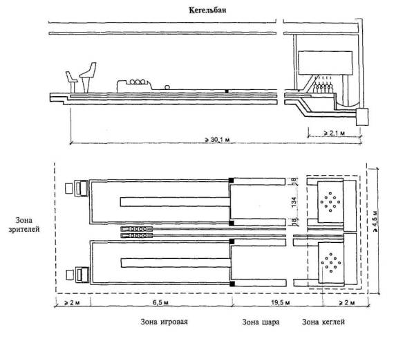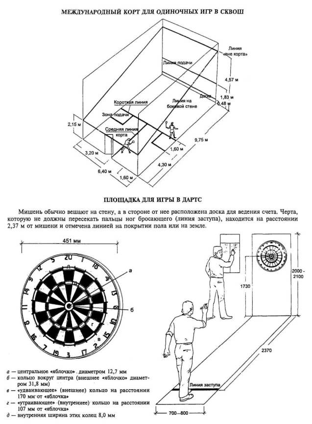 Количество дорожек должно быть четное, так как желоб для автоматического возврата шаров - один на две дорожки. Установки кеглей в конце дорожки и возврат шаров по скрытому желобу осуществляются автоматической машиной. 4.6.5 Места для зрителей следует размещать за кегельной площадкой. Между ними и сиденьями для кеглистов необходимо предусмотреть проход шириной около 1,5 м на уровне площадки для игроков. При определении количества зрителей исходят из 5 - 10 человек на одну дорожку. В кегельбанах могут предусматриваться столики для зрителей, на которые подаются еда и напитки. В этом случае рекомендуется свободное пространство 4,5 м между столиками и входами в различные вспомогательные помещения (туалеты, холлы с питьевыми или другими автоматами и т.п.). 4.6.6 Все вспомогательные и технические помещения рассчитываются по строительным и спортивно-технологическим нормам и рекомендациям. Основное требование к освещению - равномерность. Со стороны площадки окна не предусматриваются, поскольку попадающие через них солнечные лучи могут деформировать дорожки. Залы для сквоша (сквош-корты) 4.6.7 Сквош - игра с мячом и ракеткой типа теннисной. Играют два человека, поочередно отбивая мяч с лета при отражении его от стен или пола. Проводится как спортивная игра с чемпионатами и соревнованиями разных уровней и как спортивно-оздоровительная и развлекательная; играют взрослые всех возрастов и дети с 11 - 12 лет. Рэкэтбол - разновидность сквоша. Правила схожи с правилами сквоша, но несколько упрощены. Отличается мяч, который больше в два раза, имеет больший отскок. Игра проводится в залах для сквоша с той же разметкой. 4.6.8 Размер площадки для игры - 9,75´6,4 м. Требуемые планировочные размеры сквош-корта и высота помещений до уровня поверхности осветительных приборов показаны на рис. 4.60. 4.6.9 Физкультурно-оздоровительный или спортивно-развлекательный зал - сквош-корт (один или несколько), имеющий небольшие размеры, целесообразно включать в досуговые центры или центры спорта и отдыха. Отдельно стоящие центры или клубы сквоша строятся как спортивные с выполнением всех требований для соревнований и в то же время могут использоваться и как физкультурно-развлекательные. Для соревнований на высоком уровне число кортов для сквоша должно быть 4 - 8, а с точки зрения окупаемости - 4 - 6. 4.6.10 Там, где нет возможности устроить постоянные сквош-корты, могут быть применены сборные - для оздоровительных и спортивно-развлекательных игр в уже имеющихся спортивных или общественных залах соответствующих размеров. 4.6.11 Стены и пол зала - элементы игровой зоны, поэтому они должны быть светлыми (лучше белыми), чтобы игроки без труда могли фиксировать мяч. Покрытие (отделка) стен должна выдерживать удары мяча. 4.6.12 Корт для турнирных игр может иметь трибуны вместимостью до 200 зрителей, в этом случае в зале должна быть задняя прозрачная стенка со стационарными местами для зрителей за ней (от 50 до 100 мест). Могут применяться и трансформируемые места. Для увеличения количества зрительских мест и точек обзора целесообразно делать прозрачной заднюю стенку, а в ряде случаев и боковые стенки. 4.6.13 Вспомогательные помещения - раздевальные, душевые и туалеты для мужчин и женщин. Количество шкафчиков в раздевальных, учитывая, что на корте одновременно играют 2 человека, должно быть 4 - 6 на один кор