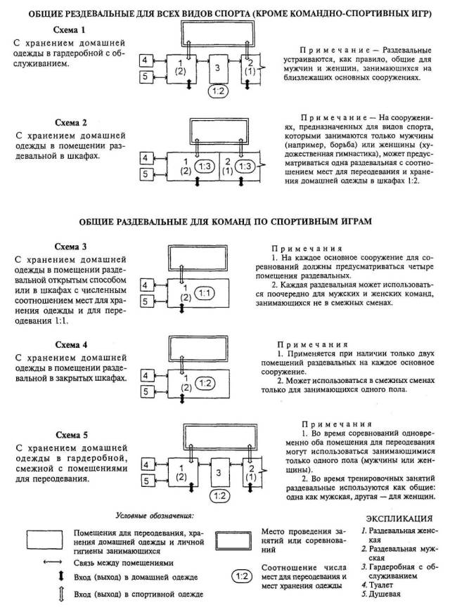 5 Вспомогательные помещения5.1 Общие положения5.1.1 Развернутый состав помещений вспомогательного назначения в учебно-тренировочных сооружениях включает следующие группы: вестибюль с гардеробом, блоки раздевальных, душевых и санузлов для занимающихся, инвентарные, тренерские и административные помещения. Очень важны для функционирования такие помещения, как медицинские пункты, методические кабинеты, бытовые для персонала. Получили распространение реабилитационные помещения, комнаты отдыха, мастерские, пункты проката. Примечание - Состав и уровень комфорта вспомогательных помещений физкультурно-оздоровительных занятий может быть выше по сравнению с чисто спортивными занятиями за счет дополнительных помещений для отдыха, консультаций и восстановительных процедур. 5.1.2 Состав и расчетная площадь вспомогательных помещений для занимающихся в спортивных залах указаны в таблице 5.1.