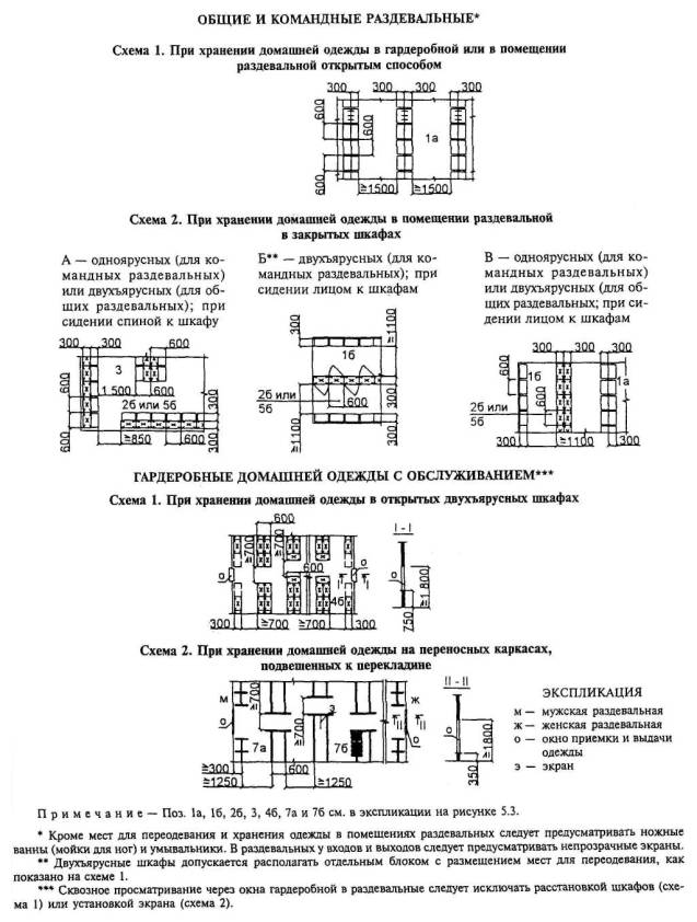 5.3.8 При расстановке скамей для переодевания и шкафов для хранения домашней одежды в раздевальных, гардеробных и душевых принимаются следующие минимальные размеры ширины проходов по таблице 5.5 и рисункам 5.2 - 5.5. Таблица 5.5