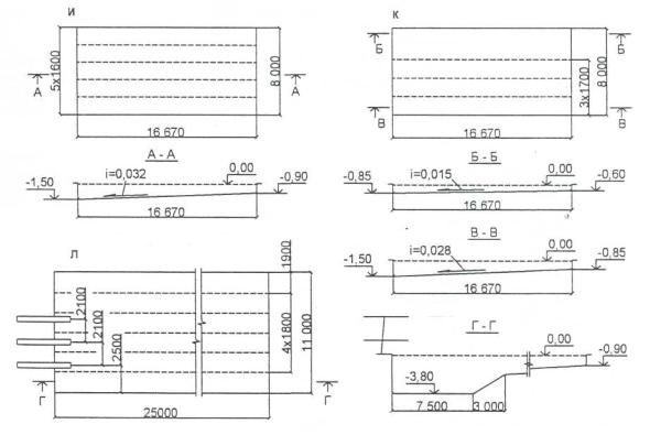 и – ванна 16,6´8 м; к – ванна 16,6´8 м с различной глубиной; л – ванна 25´11 м с прыжковыми устройствами