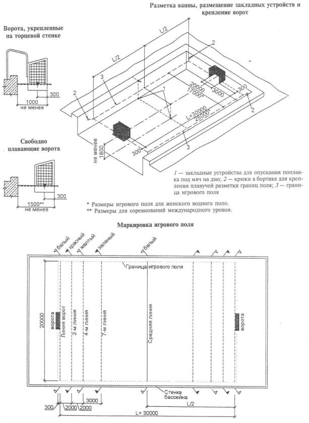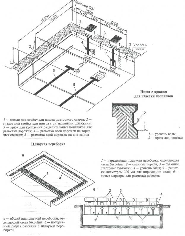 4.1.4 В основу расчета пропускной способности бассейна положена пропускная способность одной дорожки. Поэтому для дорожек длиной 25 м она принимается 8 человек, а для 50-метровых 12 человек. При организации занятий поперек ванны или на дорожках уменьшенной ширины для ванны 50´25 м расчет следует вести на 20 поперечных дорожек с общей пропускной способностью 160 человек, а для ванны 50´21 м - на 10 продольных дорожек шириною по 2 м, т.е. на 120 пловцов. Ванна 25´16 м может быть разделена на восемь дорожек шириною по 2 м с общей пропускной способностью 64 человека; в ванне 25´11 м может быть 6 дорожек по 1,8 м (пропускная способность 48 человек), а ванна 25´8,5 м может принять на 5 дорожках 40 пловцов. Пропускная способность учебных детских ванн, не разделяемых на дорожки, исчисляется исходя из методики занятий, предусматривающей группу в 20 человек. Пропускная способность при игре в водное поло на «полномерной» площадке 30´20 м - 25, а в 25-метровых ваннах - 15 человек. На каждой платформе вышки и на каждом трамплине могут одновременно заниматься 6 прыгунов, но пропускная способность полного комплекта прыжковых устройств (вышки с платформами 10; 7,5; 5; 3 м, по два трамплина высотою 3 и 1 м) с учетом разновременности прыжков принимается в 30 человек. 4.1.5 Указатели поворота должны быть установлены на закрепленных стойках, расположенных в 5 м от каждой торцевой стенки. Поперек бассейна на высоте от 1,8 до 2,5 м от поверхности воды подвешиваются веревки с флажками. На расстоянии 15 м от каждой торцевой стенки делаются четкие отметки на обеих боковых стенках бассейна и, по возможности, на каждом разделителе дорожек (рисунок 4.2). 4.1.6 Веревка фальстарта должна быть подвешена поперек бассейна на высоте не менее 1,2 м над уровнем воды на стойках, закрепленных в 15 м от старта. Веревка должна прикрепляться к стойкам с помощью механизма быстрого высвобождения. При сбрасывании веревка должна перекрывать все дорожки. 4.1.7 Разметка осей дорожек должна быть темного контрастного цвета и наноситься на дно бассейна по центру каждой дорожки: ширина 0,2 - 0,3 м, длина 46,0 м при 50-метровых бассейнах; 21,0 м в 25-метровых бассейнах. Каждая линия разметки должна оканчиваться за 2 м до торцевой стенки четкой поперечной линией длиной 1 м и той же шириной, что и продольная линия. На торцевые стенки также наносятся линии разметки осей, мишени той же ширины, что и вдоль дорожек. Они должны идти от бордюра до дна бассейна. Поперечная линия длиной 0,5 м наносится на глубине 0,3 м от поверхности воды, считая от центра поперечной линии. 4.1.8 Когда в качестве торцевой стенки используется плавучая переборка, она должна простираться на всю ширину ванны и представлять собой твердую, гладкую, нескользкую, устойчивую вертикальную поверхность. Сенсорные панели могут устанавливаться на нее не глубже чем 0,8 м ниже уровня воды и не выше 0,3 м над уровнем воды. Ни выше, ни ниже уровня воды не должно быть никаких непредвиденных отверстий, в которые могли бы попасть руки, ноги или пальцы рук и ног пловца. Конструкция переборки должна обеспечивать возможность ее свободного передвижения, не приводящего к каким-либо течениям или турбуленции воды. Оборудование ванн для плавания 4.1.9 Переливные желоба (пенные корытца) служат для поддержания постоянного уровня воды, удаления загрязненного верхнего слоя, также для гашения волн, возникающих при плавании