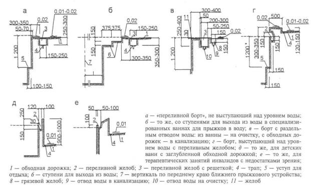 4.3.5 Край ванны бассейна по всему периметру должен выделяться полосой, имеющей контрастную окраску по отношению к обходной дорожке. В ваннах бассейнов, где возможны занятия слепых спортсменов, на обходных дорожках должны предусматриваться специальные полосы для информации и ориентации. 4.3.6 Ширина полос ориентации для ванн - не менее 1,2 м. За ней должно быть установлено предупреждающее ограждение с поручнем на высоте не менее 1 м. Предупредительная цветовая маркировка должна быть на входах и выходах из бассейна, границе борта, на центровке трамплинов и стартовых тумбочек. Для получения различимой звуковой информации и снижения уровня шума рекомендуется применять перфорированный или слоистый акустический потолок. 4.3.7 В мелком конце ванны следует устраивать пологую лестницу с размерами, не менее: подступенков - 0,14 м и проступей - 0,3 м. Рекомендуется устраивать лестницу вне габаритов ванны. Лестница должна иметь стационарные поручни. Ширина лестницы для спуска в воду должна быть не менее 0,9 м. 4.3.8 Для безопасного спуска в воду инвалидов, чья подвижность целиком зависит от ортопедических устройств, следует предусмотреть установку желоба или специальных подъемников. Желоб может устанавливаться на высоте 0,5 м над уровнем обходной дорожки. Подъемники для спуска инвалидов из кресла-коляски в воду могут устанавливаться на обходной дорожке, крепиться к потолку или стене. Терапевтические ванны следует оборудовать двигающимися подвесными вспомогательными средствами. 4.3.9 Для спортивно-оздоровительного плавания рекомендуются ванны без бортов с переливной решеткой в уровне обходной дорожки. В ваннах терапевтического и двигательно-оздоровительного назначения, как и в детских ваннах, с трех сторон устраивается борт высотой 0,65 м. 4.3.10 Обходная дорожка по периметру ванн должна быть шириной не менее 2 м в крытых и 2,5 м открытых ваннах. Дорожка со стороны стартовых тумбочек и выходов из раздевальных должна быть шириной не менее 3,5 м. Вместо ножных проходных ванн у выхода из раздевальных в зал бассейна рекомендуется применять коврики, пропитанные антисептиками. 4.3.11 По внешней границе обходной дорожки следует предусматривать стационарные скамьи высотой 0,5 м. На площади обходной дорожки следует предусматривать места для хранения кресел-колясок. Вдоль стен бассейна по периметру обходной дорожки рекомендуется устраивать сплошной поручень на высоте 0,9 м от пола. Дополнительные требования см. в приложении А. На рисунке 4.11 приведены обходные дорожки и профили ванн, оборудованных для инвалидов. 4.3.12 Все рекомендации по планировочным размерам ванн закрытых бассейнов применимы к открытым бассейнам. Если из открытых бассейнов выходят через односторонние турникеты, то должен существовать обходной путь для инвалидов. 4.3.13 Средняя площадь, приходящаяся на каждую единицу оборудования в помещениях ОФП, складывается из площади, занимаемой тренажером или снарядом, размеров зон безопасности и площади для подходов. Два первых показателя являются стандартными. Третий показатель (площади для подходов к оборудованию) зависит от размеров проходов, которые увеличиваются для незрячих и «колясочников», в соответствии с характером их передвижений и необходимостью организации места, где происходит пересадка инвалида для последующих занятий. Таким образо